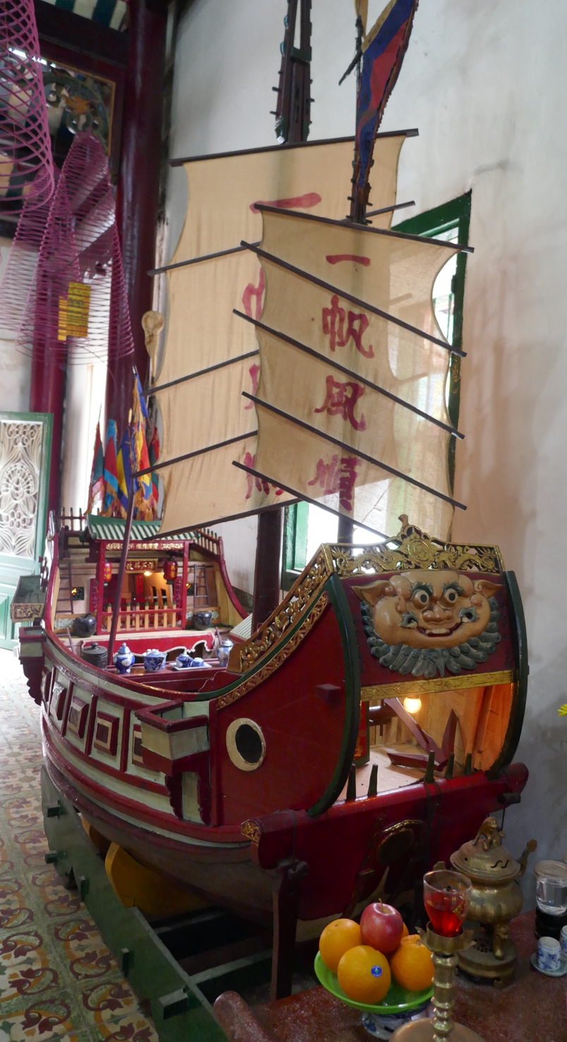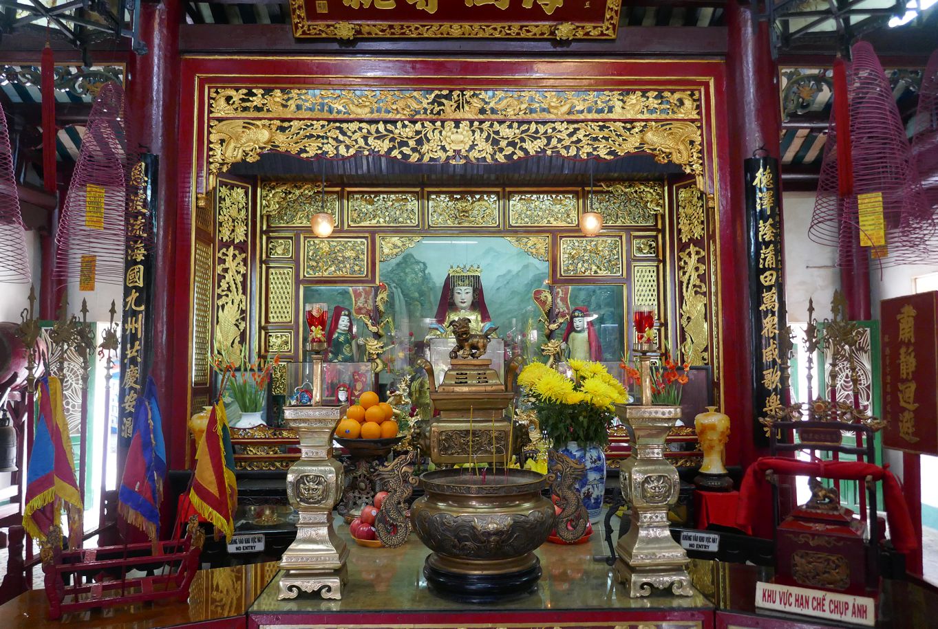 Schnell wird noch ein Tempel angeschaut, derjenige für die Göttin des Meeres, Thien Hau, die Schutz vor Stürmen bietet und Seeleuten in Not hilft. Eigentlich war es einmal eine Versammlungshalle der Fujian-Chinesen, die seit Jahrhunderten in Hoi-An leben, ein Treffpunkt und Handelsplatz, der später in einen Tempel für die Göttin umgewandelt wurde.