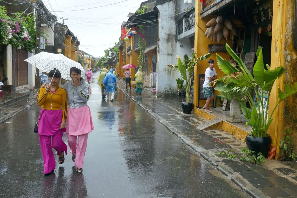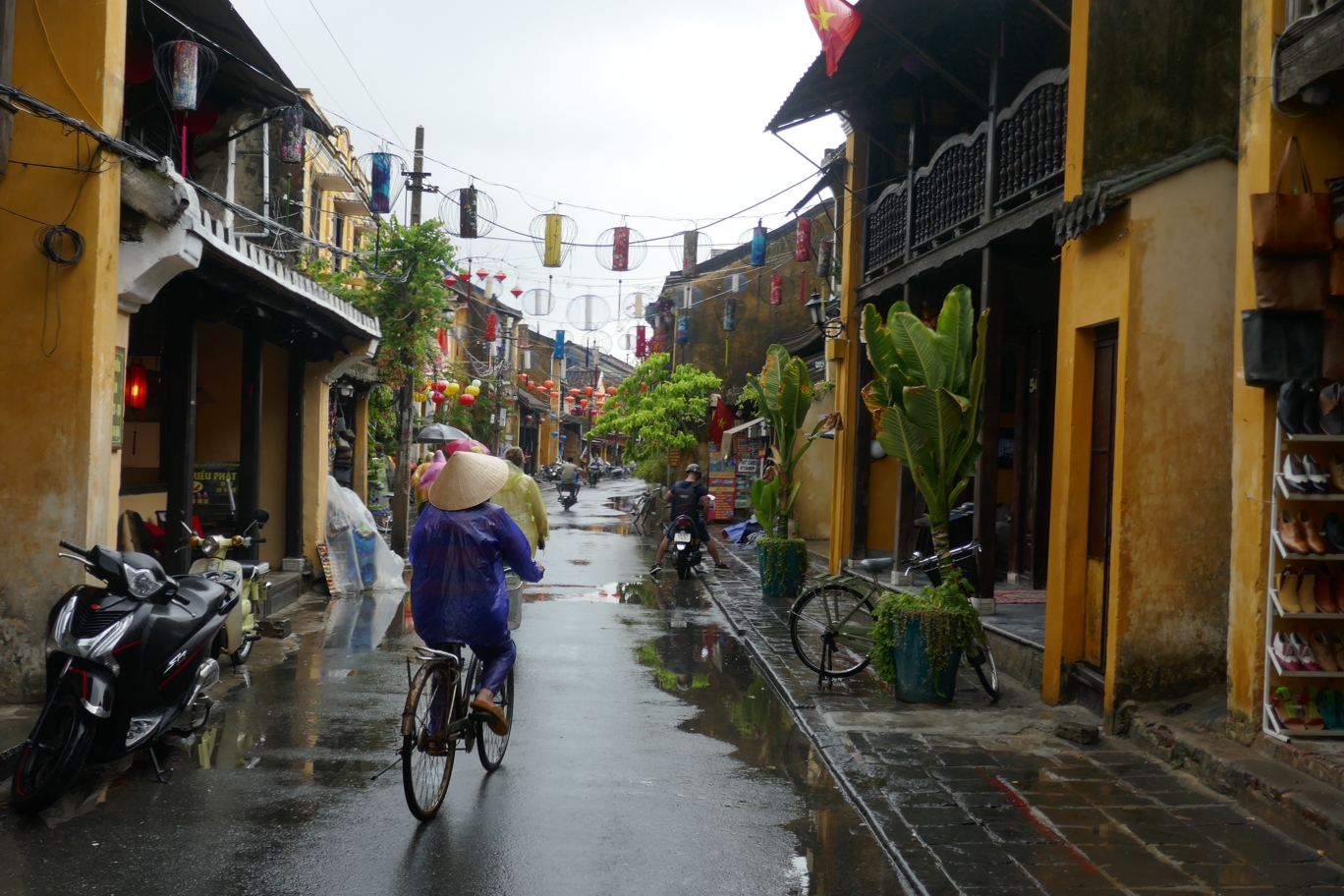 Nach dem Regen schaut die Stadt wie frisch gewaschen aus. Vor allem die Gelbtöne der Häuser sind ziemlich intensiv geworden. Nach einem Tag mit vielen Erlebnissen, vom morgendlichen Markt bis zum großen Regenschauer, machen wir uns auf den Weg zum Hotel.
