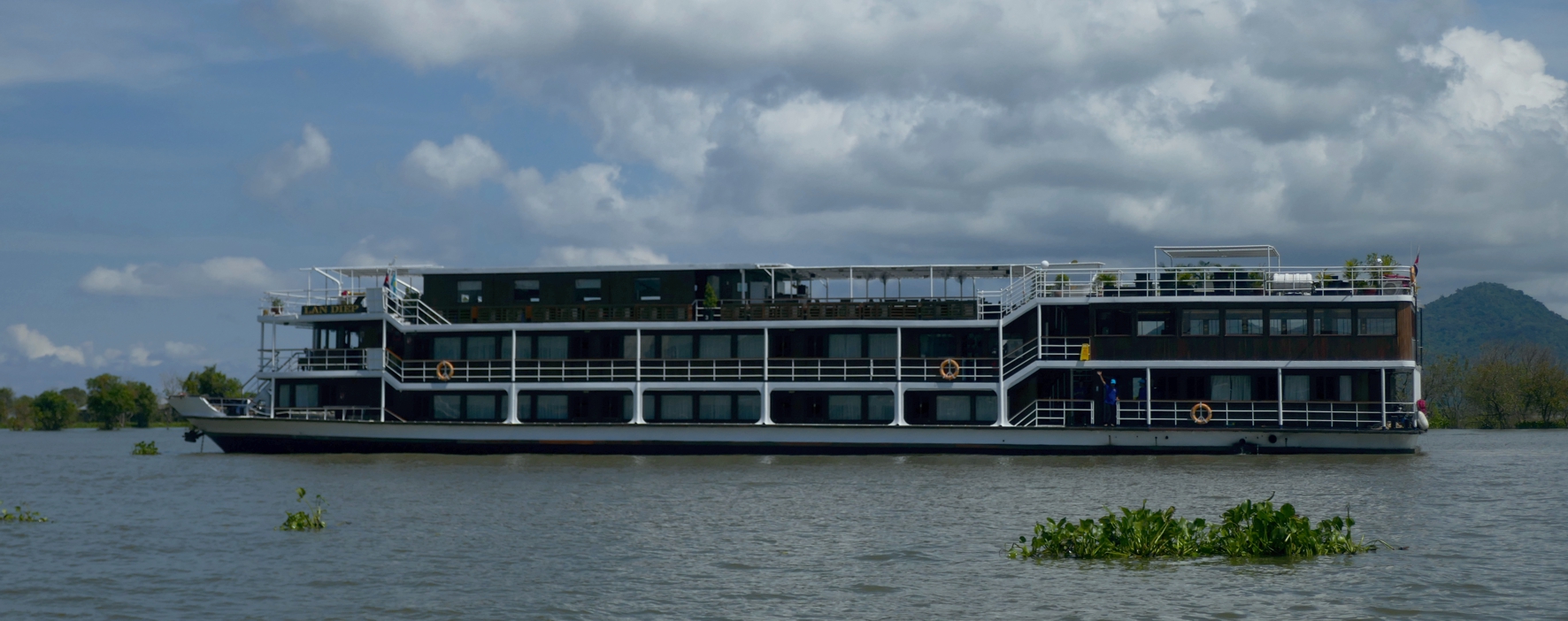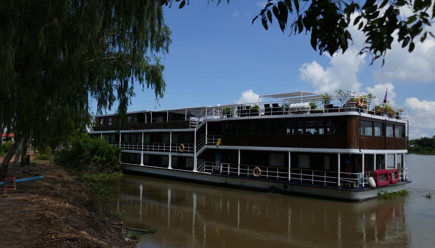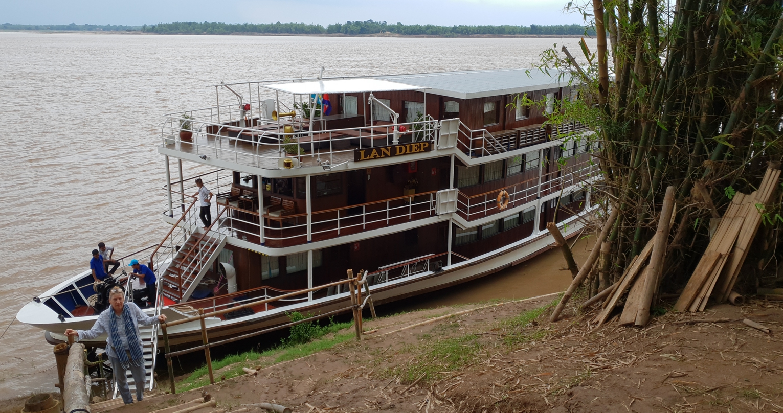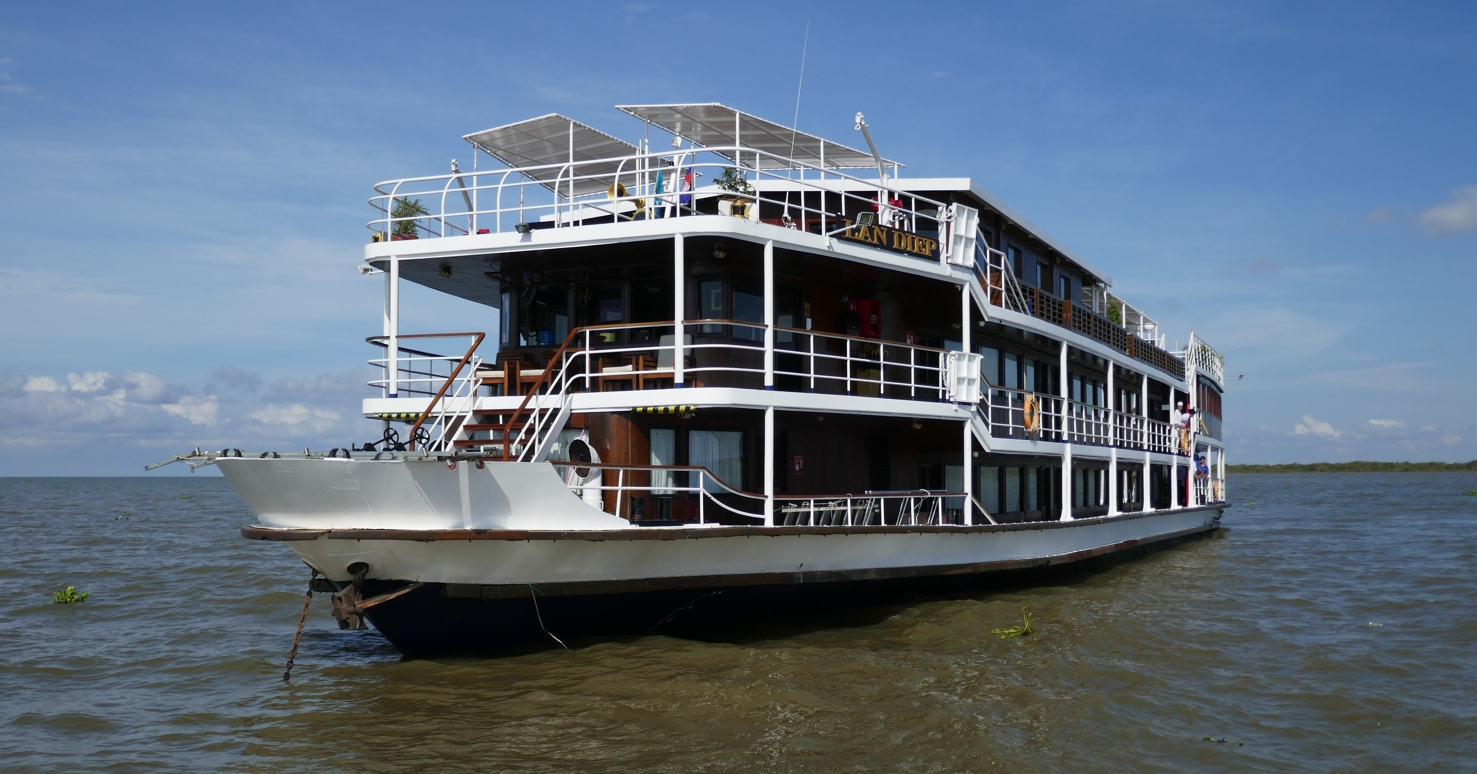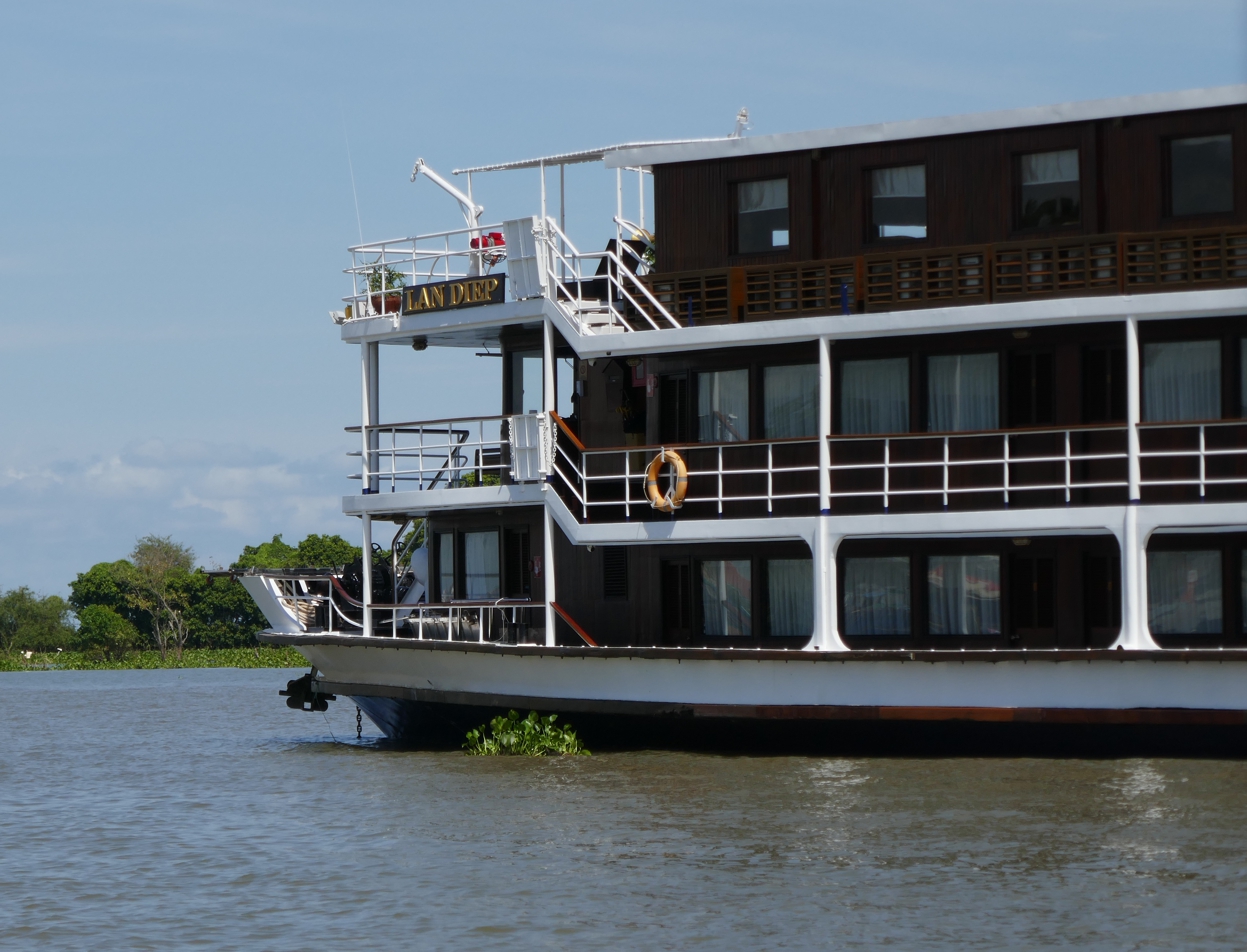 Gebaut wurde die Lan Diep 2007, renoviert 2016. Mit einer Schiffsgröße von 450 BRZ ist sie ein wirklich sehr überschaubares kleines Kreuzfahrtschiff, wenn man weiß, dass die großen Ozeanriesen inzwischen bei über 220.000 BRZ liegen. Die Fahrtgeschwindigkeit hängt sehr ab von der Strömung – zwischen 18 und 40 Stundenkilometer ist möglich. Gefahren wird unter kambodschanischer Flagge. Und unterwegs ist das Schiff für Phoenixreisen aus Bonn.