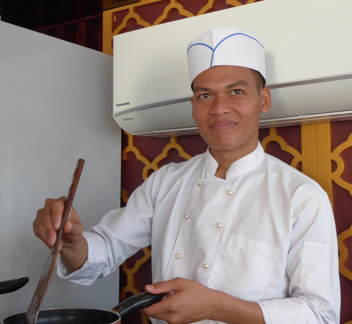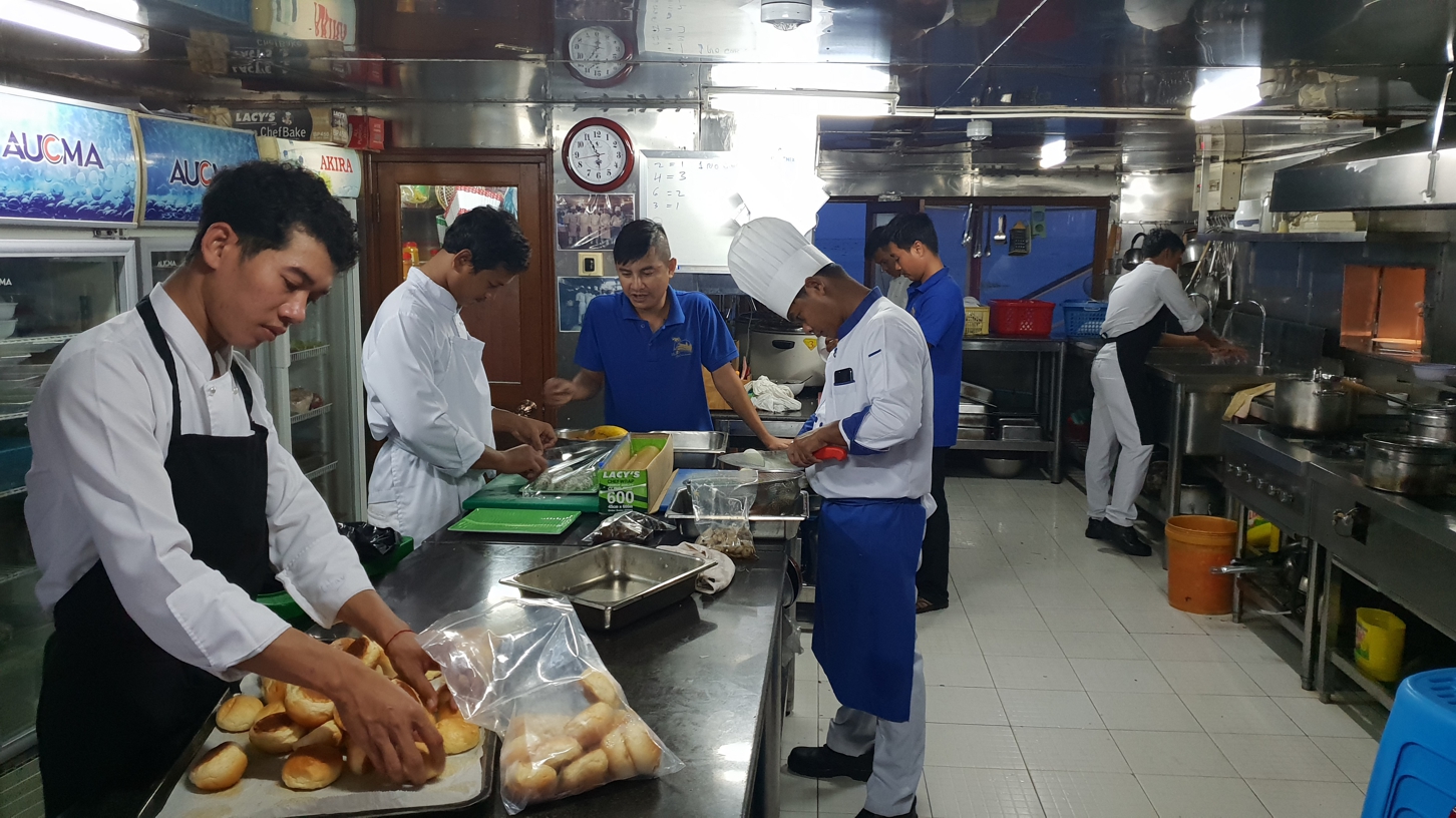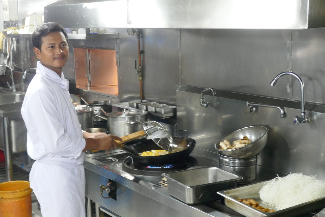 In der Küche „zaubern“ vietnamesische und kambodschanische Köche gemeinsam allerhand regionale Gerichte, haben aber sicherlich die Geschmacksnoten etwas europäisiert – für uns hätte es gerne öfters noch ein wenig exotischer schmecken dürfen. Aber sei’s drum, es hat geschmeckt, und immer mal waren Zutaten mit dabei, die bei uns nicht so alltäglich auf den Tisch kommen, ob Lotusstengel und Lotuswurzeln, Wassergurken und Wasserspinat, Bananenblüte und frische Palmherzen, Zitronengras und Langbohnen, Drachenfrucht und Jackfruit und mehr. Die Suppen von eher bekannt nach Huhn schmeckend über süß-sauer oder eher glibberig bis hin zu säuerlich. Die Salate bunt und ungewöhnlich zusammengestellt. Bei den Hauptspeisen bekannt scheinende Gerichte, wenn man ab und an beim Vietnamesen essen geht, allesamt gut und schmackhaft, und bei den Gemüsen manche Neuigkeit – angenehm, fast vorsichtig gewürzt, manchmal Ingwer, und oft heftig Knoblauch mit dabei.