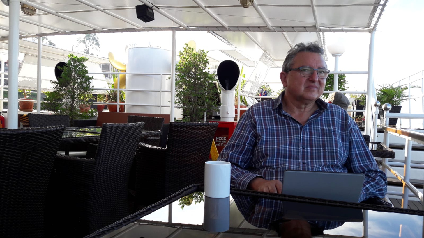 Auf der oberen Promenade kommt man direkt zum Kapitän, wenn man möchte, auch auf die kleine Brücke – unser Kapitän hat noch ein richtiges Steuerrad vor sich, und weit weniger Technik, als man sonst so gewohnt ist. Später hören wir, dass die Erfahrung des Kapitäns mit dem Fluss und vor allem mit dem Verhalten der Menschen, die darauf unterwegs sind, im Mekong-Delta, auf dem Mekong, auf Tonle Sap Fluss und See, ebenso wie auf den vielen Kanälen weit wichtiger ist als jegliche Technik. Unser Kapitän, ein Vietnamese, hat lange Erfahrung – und hat als stellvertretenden Kapitän seinen Sohn dabei; auffallend für uns auf der Reise, dass letzterer nur die einfacheren Passagen alleine fährt.