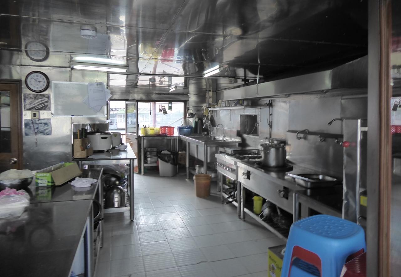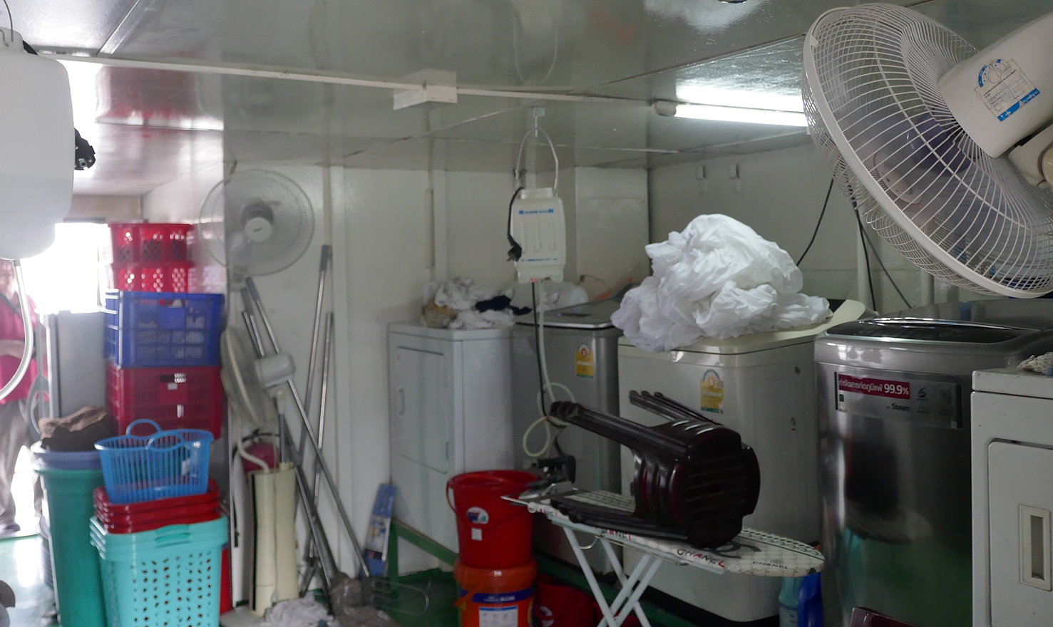Auf einem ersten Schiffsrundgang zeigt sich, dass man auf der Lan Diep so ziemlich überall hingehen kann, und überall mit einem netten Lächeln empfangen wird. Ist mit Worten mal nichts Verständliches zu machen, dann wird unverständliche Sprache ergänzt mit Gestik, oder man wird irgendwohin geführt. Ich gehe ums Promenadendeck, und aus der ersten Tür, die weit offen steht, hört man Unterhaltung und fröhliches Lachen. Zwei junge Frauen stehen in der kleinen Bordwäscherei. Sprachlich geht nichts, eine zeigt mir die Wäscheliste und nach einigem hin und her kapiere ich, dass man all das, was man abgibt, normalerweise am selben Tag gleich wieder gewaschen und gebügelt zurück bekommt. Eine Etage drüber ist die Küche, noch nichts los, aber am Abend wird’s geschäftig.