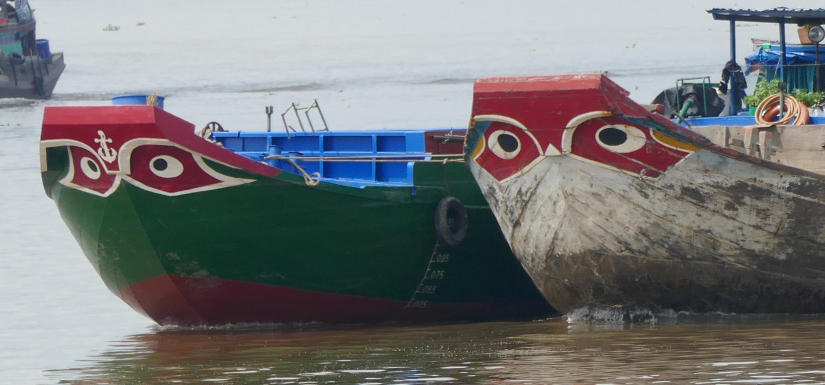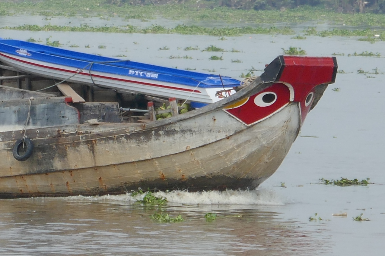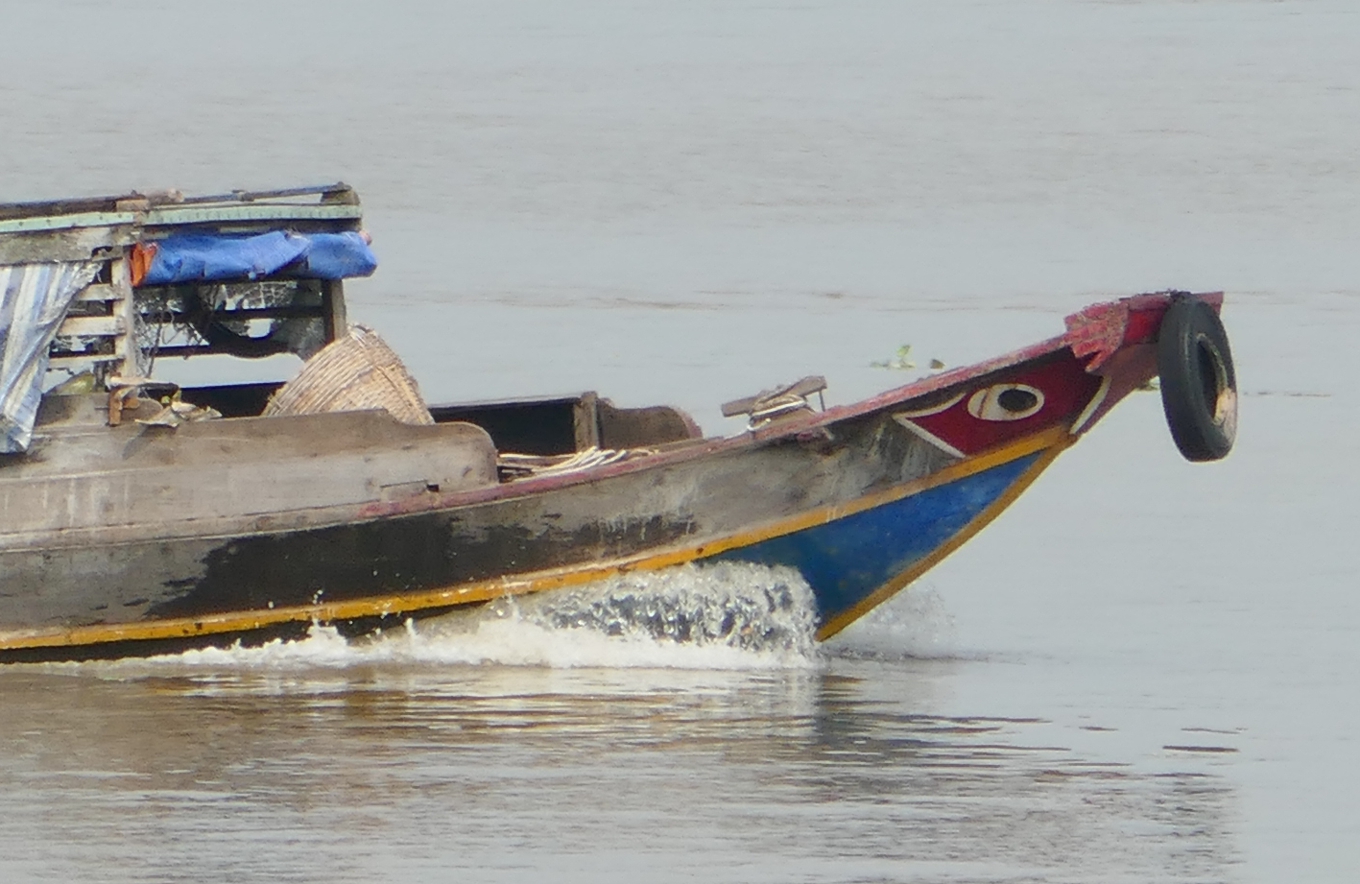 Es scheint ein sehr sicheres Schiff zu sein – denn vorne am Bug blicken uns nicht die Augen an, die sonst auf fast allen Schiffen auf dem Mekong aufgemalt sind, und um die sich unterschiedliche Geschichten ranken. Eine davon handelt von den inzwischen nicht mehr vorhandenen Mekong-Krokodilen. Die Fischer hätten sich vor denen gefürchtet und ihr Schiff so angemalt, dass es ähnlich wie ein Krokodil blickte. Das Schiff war größer, der Fischer hatte das größere „Krokodil“, und so konnte er sich sicher fühlen. Eine andere gründet in einer Art Schiffstaufe, einer Zeremonie, in der dem Schiff die Augen geöffnet werden, indem sie aufgemalt werden, was dem neuen Boot Glück, eine hellwache Mannschaft und eine sichere Fahrt bringen soll.