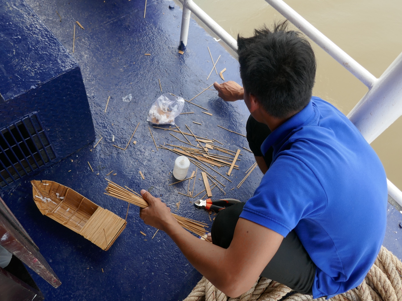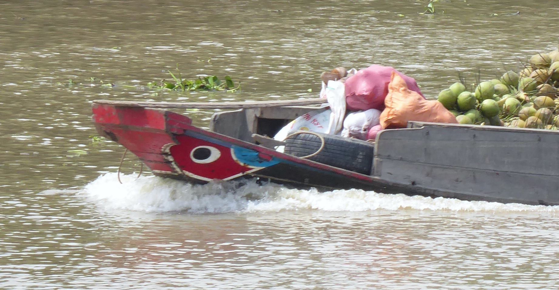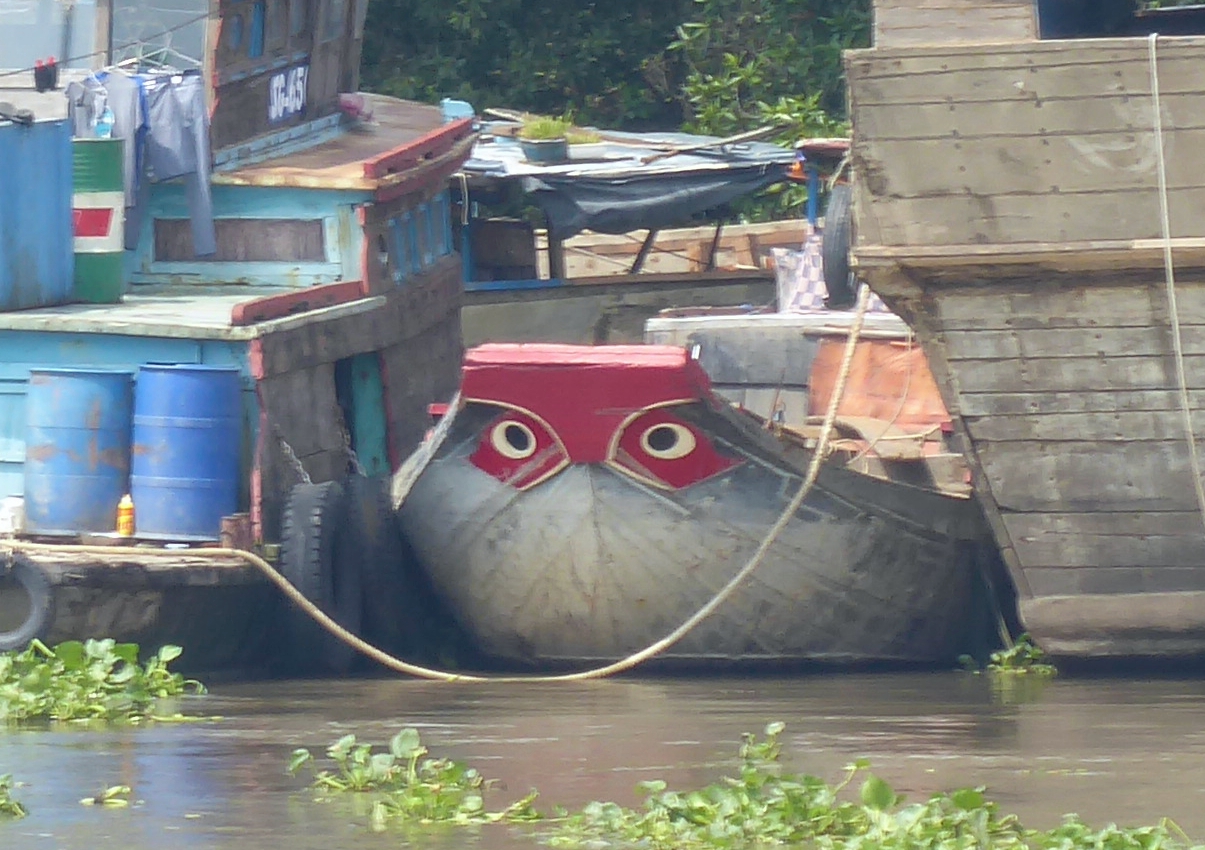 Es scheint ein sehr sicheres Schiff zu sein – denn vorne am Bug blicken uns nicht die Augen an, die sonst auf fast allen Schiffen auf dem Mekong aufgemalt sind, und um die sich unterschiedliche Geschichten ranken. Eine davon handelt von den inzwischen nicht mehr vorhandenen Mekong-Krokodilen. Die Fischer hätten sich vor denen gefürchtet und ihr Schiff so angemalt, dass es ähnlich wie ein Krokodil blickte. Das Schiff war größer, der Fischer hatte das größere „Krokodil“, und so konnte er sich sicher fühlen. Eine andere gründet in einer Art Schiffstaufe, einer Zeremonie, in der dem Schiff die Augen geöffnet werden, indem sie aufgemalt werden, was dem neuen Boot Glück, eine hellwache Mannschaft und eine sichere Fahrt bringen soll.