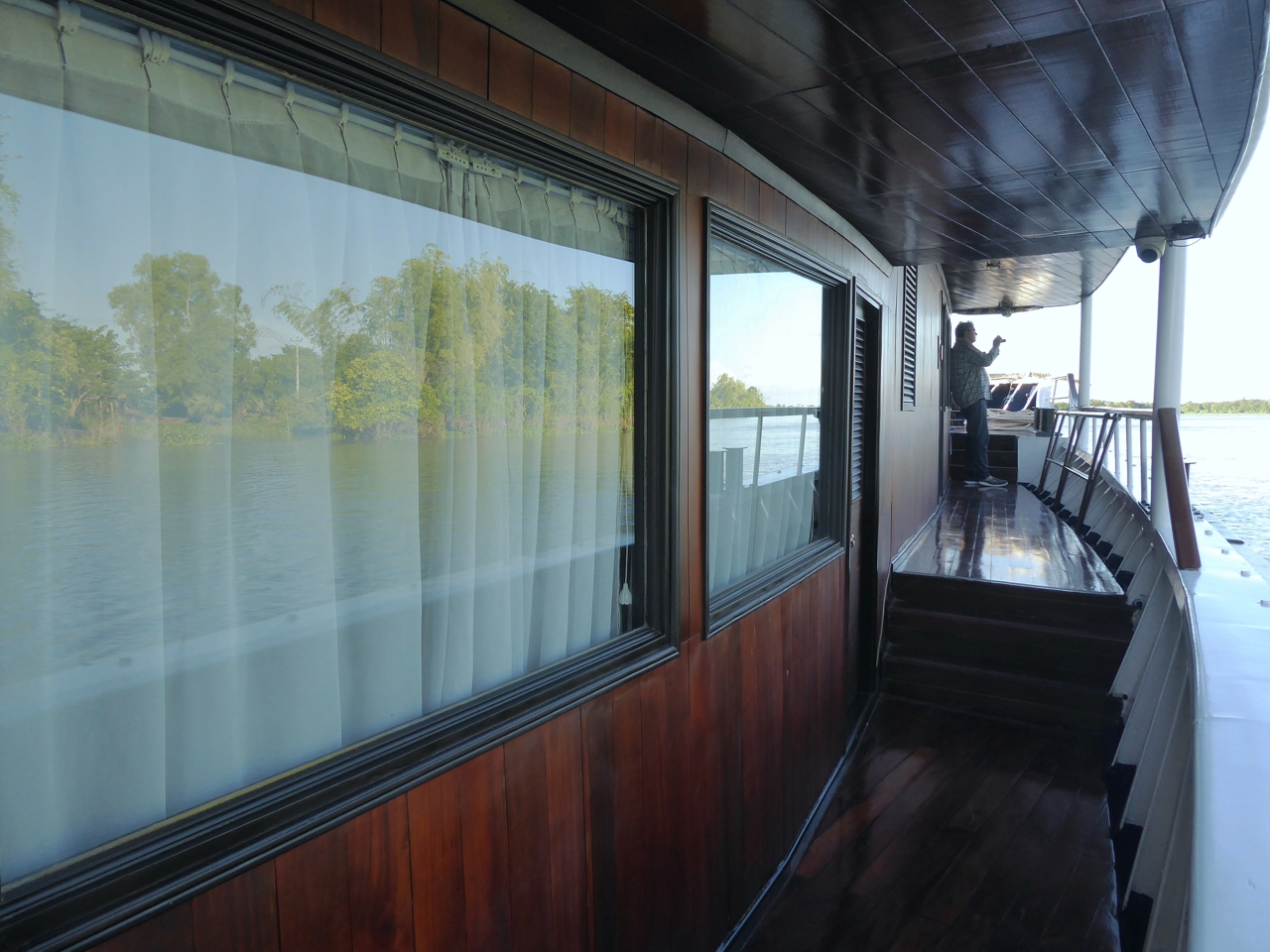 Unser Lieblingsplätzchen auf dieser Reise auf der Lan Diep war auf dieser Reise ganz vorne auf dem Schiff, direkt beim Kapitän. Unmittelbar vor der Brücke stehen auf dem Außendeck vier sehr bequeme Stühle, in schönster Aussichtslage in Fahrtrichtung, auch mit bestem Blick nach links und rechts, zum Ufer hin. Meist werden wir hier ein Plätzchen finden, von dem aus wir all das genießen können, was rundum zu sehen ist – und auch unendlich viele Fotos machen, von denen einige in diesen Reiseberichten zu sehen sind. Für uns ist es ganz angenehm, dass dieser Aussichtsplatz kaum nachgefragt ist – vielleicht weil es hier vorne keine Cocktails und auch keine Internetverbindung gibt.