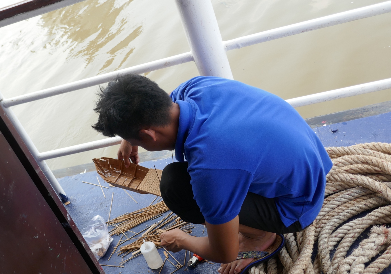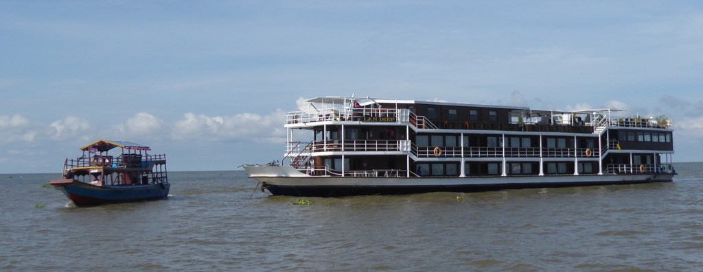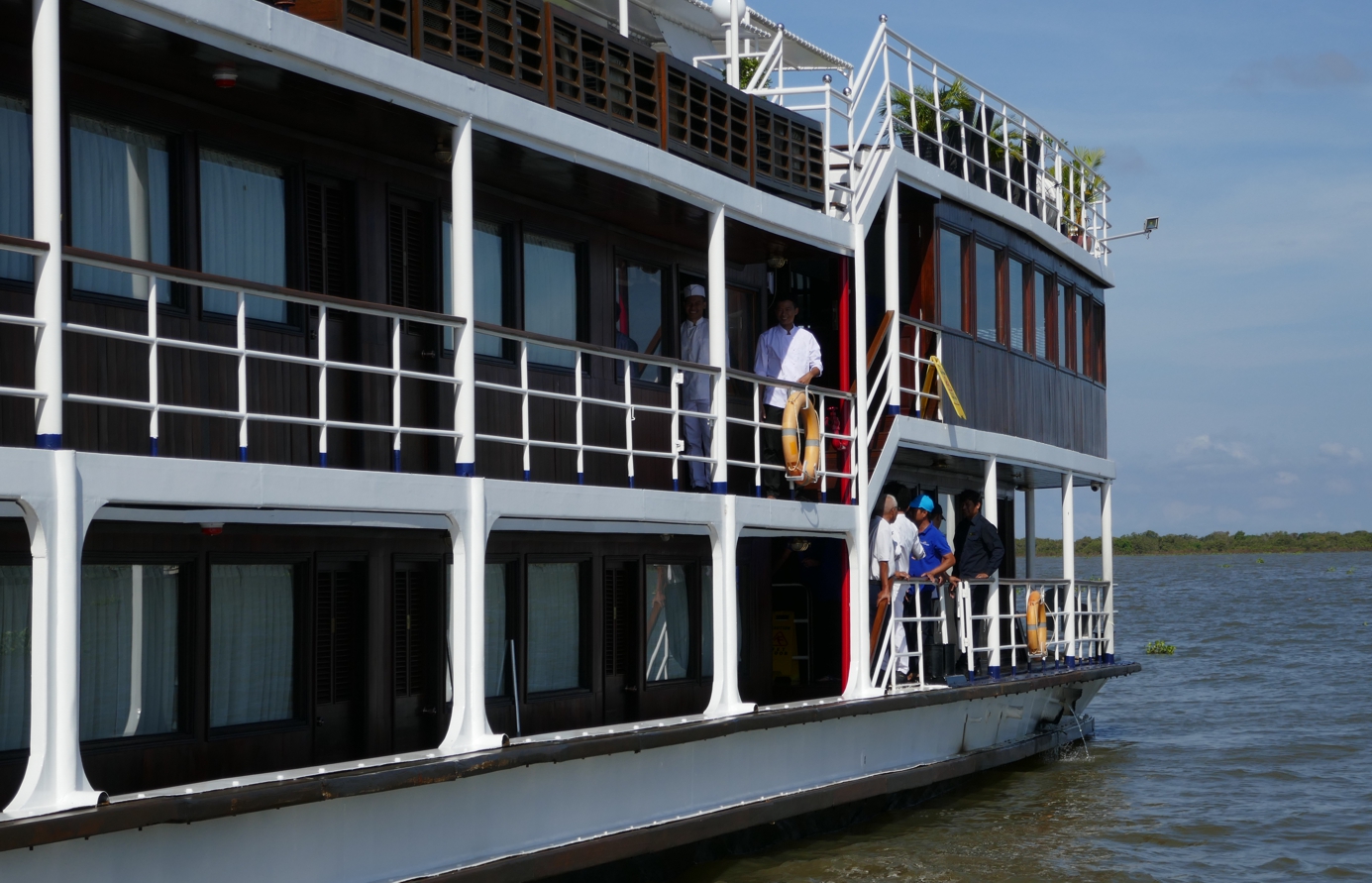 Den Schiffsnamen „Lan Diep“ hatten wir uns schon eingeprägt – aber dass dieser Name die vietnamesische Übersetzung von „Romeo und Julia“ ist, darauf wären wir nicht gekommen. Also reisen wir auf „Romeo und Julia“ und lassen uns überraschen. Platz ist auf der Lan Diep für etwa 40 Passagiere, auf unserer Reise sind nur 27 an Bord – angenehm, so ist es überall recht entspannt. Umsorgt werden wir tatsächlich von 22 Crew-Mitgliedern, also eine im Vergleich zu anderen Reisen traumhafte Passagier-Crew-Relation. Fast alle sind Kambodschaner, ein paar Vietnamesen drunter, dazu die deutsche Bordreiseleitung von Phoenix, und immer wieder wechselnd wird ein regionaler Reisebegleiter mit dazu kommen.