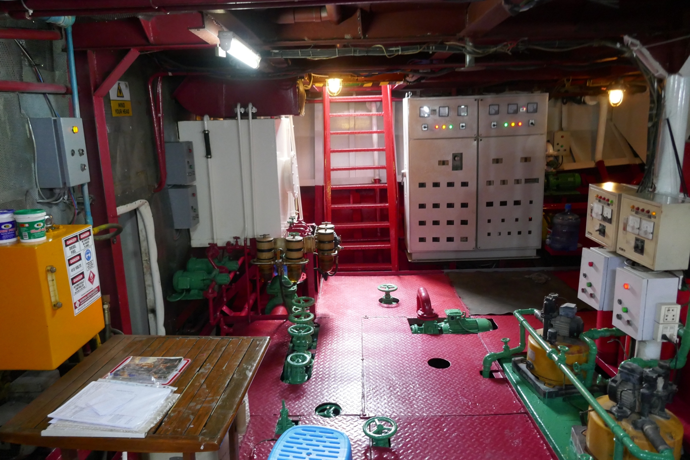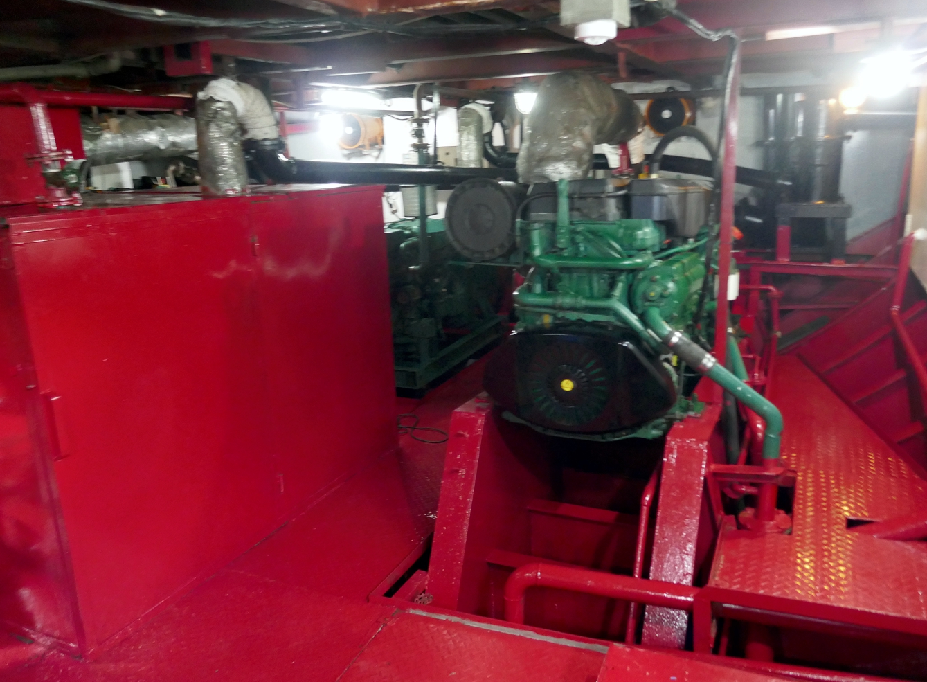 Im Heckbereich geht es hinunter in den Maschinenraum. Die Tür steht offen, kein Problem, in der kleinen Dieselwolke hinunterzusteigen. Drunten sieht man ein wenig Technik, Volvo-Motoren und -Generatoren – ein blitzblanker, sauberer, frisch gestrichener Bereich.