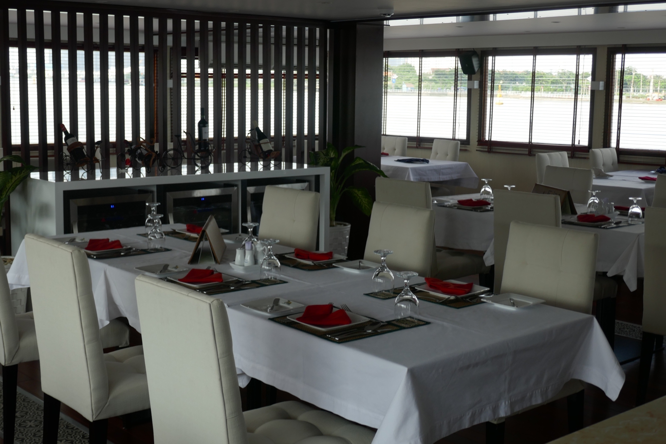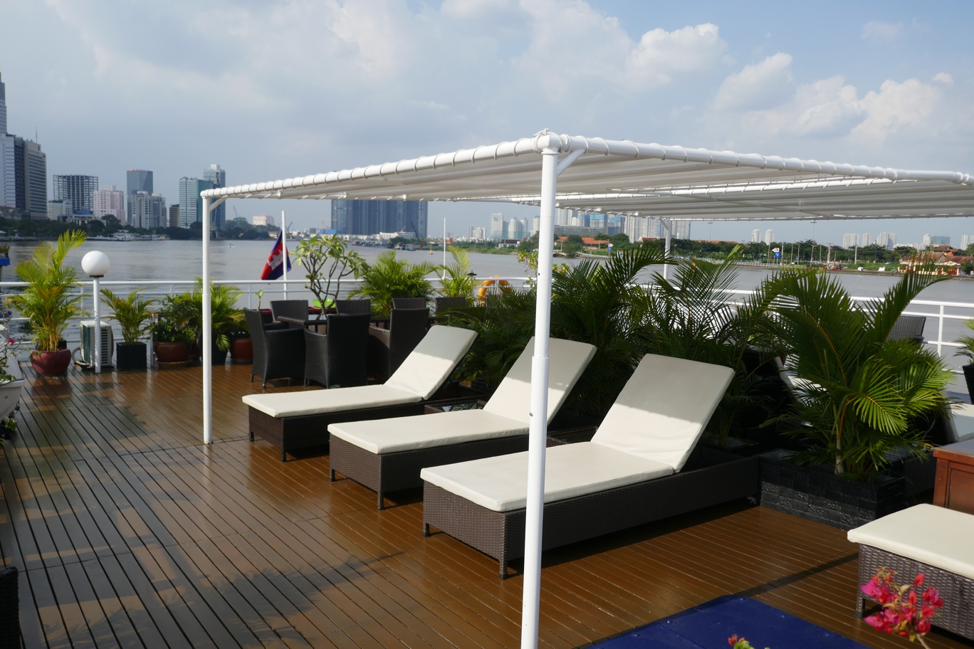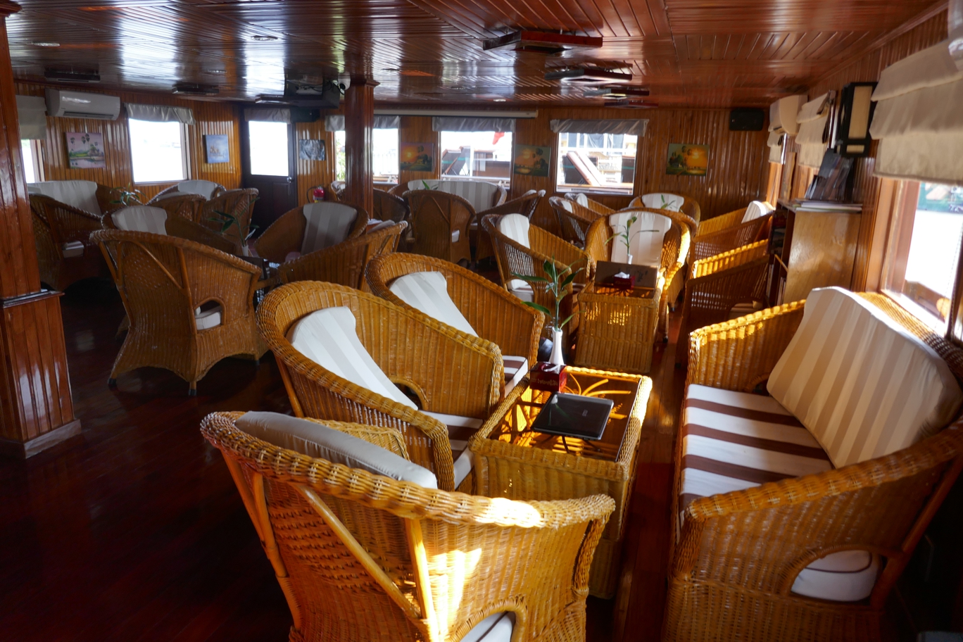 Wir haben uns für das untere Deck entschieden, haben viele Bilder im Kopf von den schwimmenden Märkten und dem Leben am Fluss, und wollen ziemlich nahe am Geschehen auf dem Wasser wohnen. Auf dem Oberdeck gibt es viele Möglichkeiten, draußen zu sitzen, zudem einen gemütlichen und vor allem klimatisierten Salon – unverzichtbarer Rückzugsbereich, wenn man der Hitze draußen einmal entfleuchen und nicht in der Kabine sitzen möchte. Hinten im Heck liegt das Restaurant, angenehm und bequem ausgestattet, mit hellem Mobiliar und rundum großen Fensterflächen.