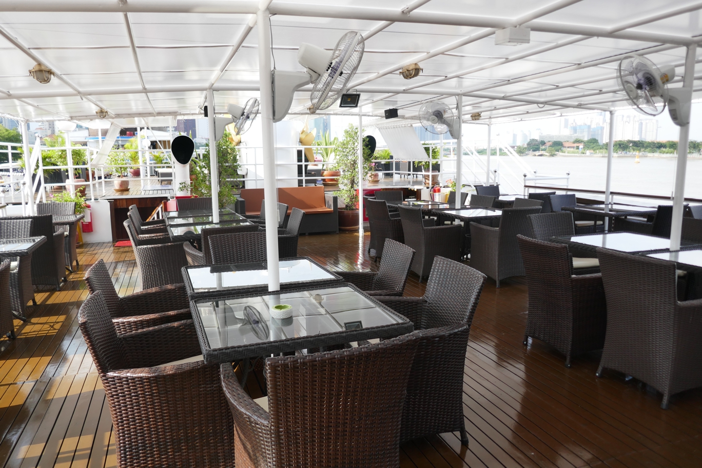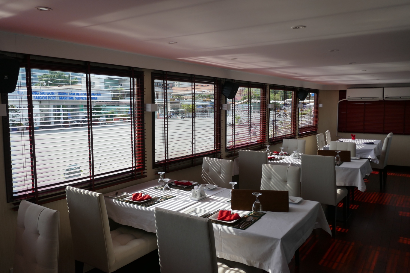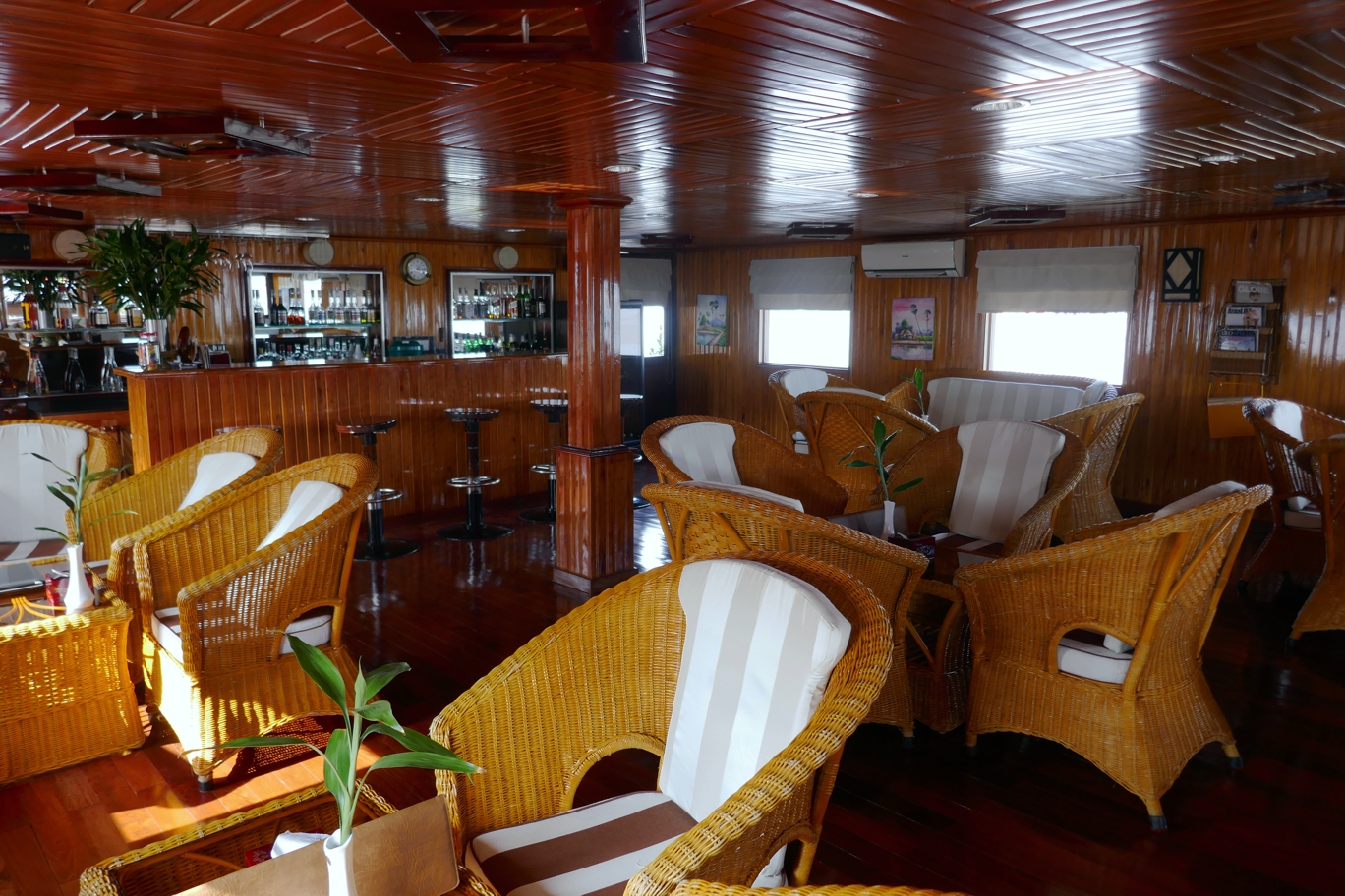 Wir haben uns für das untere Deck entschieden, haben viele Bilder im Kopf von den schwimmenden Märkten und dem Leben am Fluss, und wollen ziemlich nahe am Geschehen auf dem Wasser wohnen. Auf dem Oberdeck gibt es viele Möglichkeiten, draußen zu sitzen, zudem einen gemütlichen und vor allem klimatisierten Salon – unverzichtbarer Rückzugsbereich, wenn man der Hitze draußen einmal entfleuchen und nicht in der Kabine sitzen möchte. Hinten im Heck liegt das Restaurant, angenehm und bequem ausgestattet, mit hellem Mobiliar und rundum großen Fensterflächen.