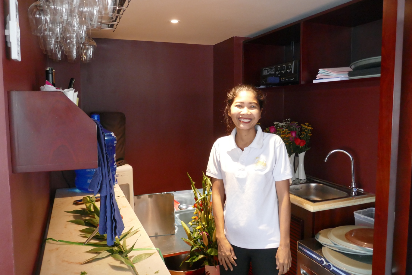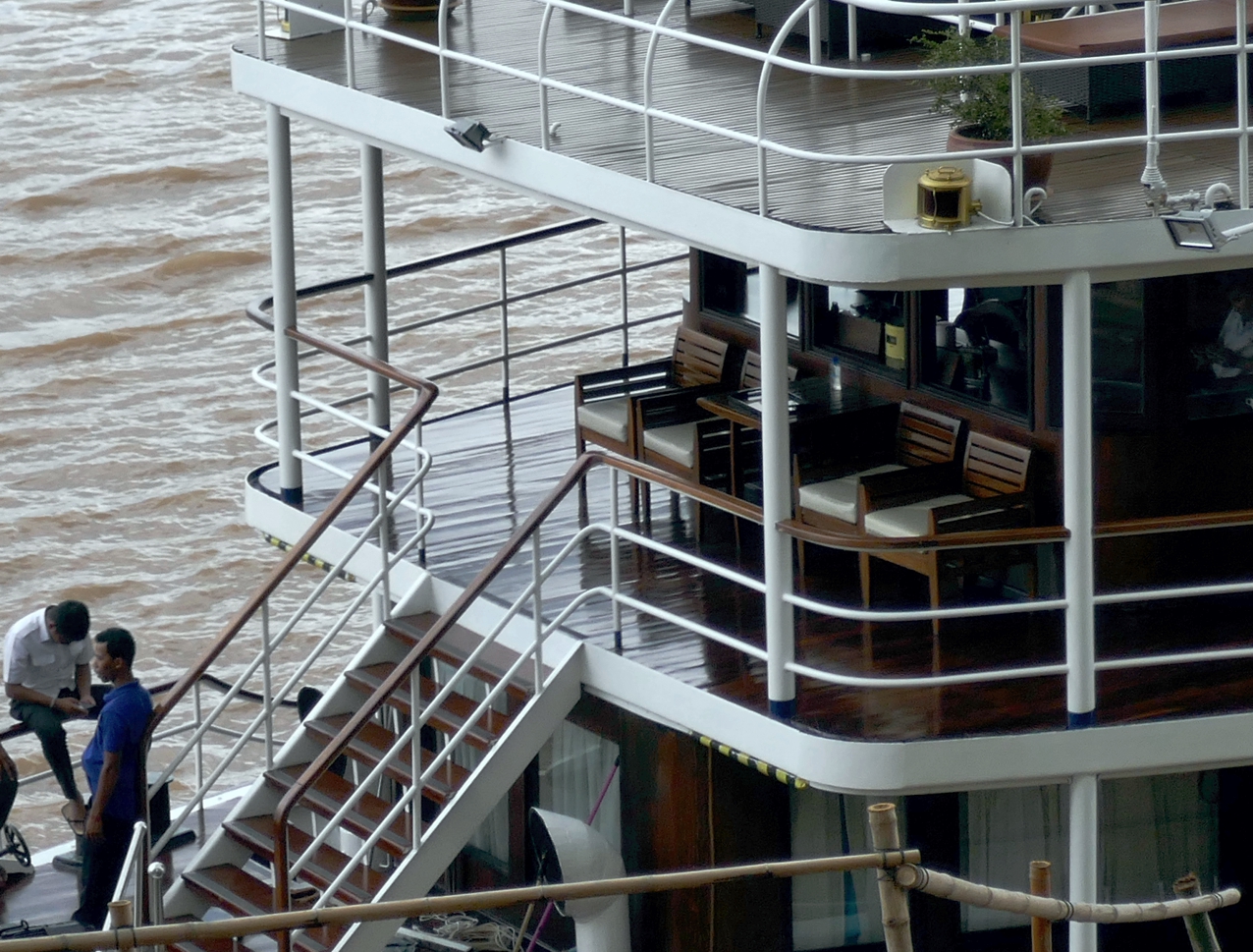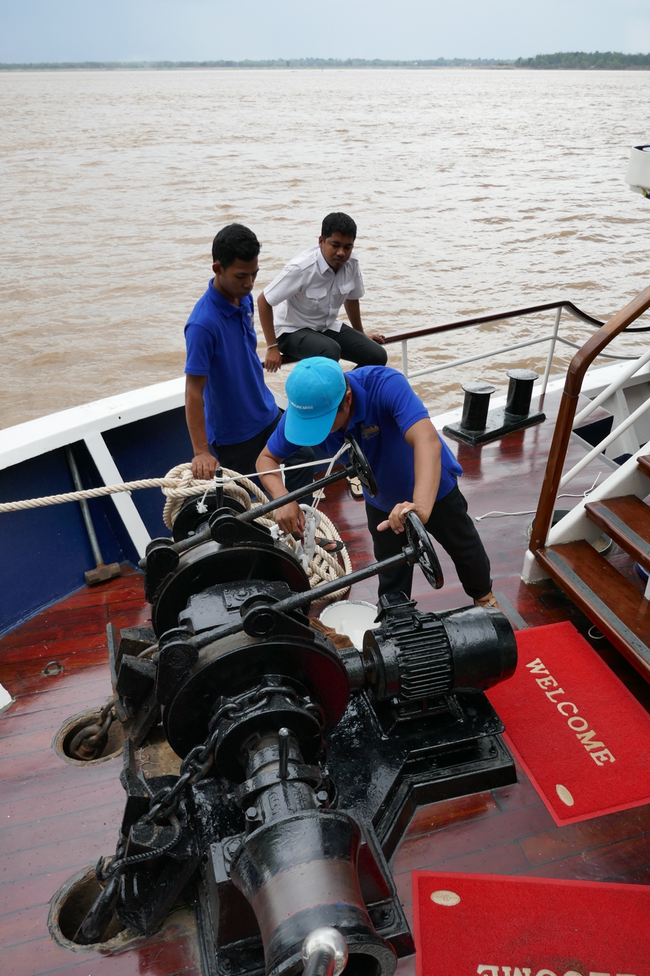 Auf der Reise zeigt sich dann, dass wir eine wirklich nette, freundliche, aufmerksame und kompetente Crew an Bord haben, ob beim Service im Restaurant, in der Kabine oder sonstwo an Bord. Im Restaurant wird richtig und zügig und freundlich serviert und gegebenenfalls nachgelegt oder nachgeschenkt. An der Bar auf dem Sonnendeck gibt es kein mürrisches Gesicht, wenn man „nur“ ein kostenloses Wasser trinken will. Bei Landgängen gibt es Hilfestellungen bei wackligen Treppen und matschigen Aufstiegen an der Böschung, und bei Rückkehr werden die Schuhe grundgereinigt. Die Kabine wird ein paar mal gereinigt, immer sind viele, nicht nur ausreichende kostenlose Wasserflaschen da, der Wäscheservice funktioniert fast im Stundentakt. Alle Crewmitglieder sprechen ein wenig englisch und auch ein wenig deutsch, aber Verständigung ist immer mit einem lächeln, notfalls mit ein paar Zeichen möglich – und wenn man möchte, kann man auch ein paar Worte in der Khmer-Sprache lernen, aber die kann man sich kaum merken.