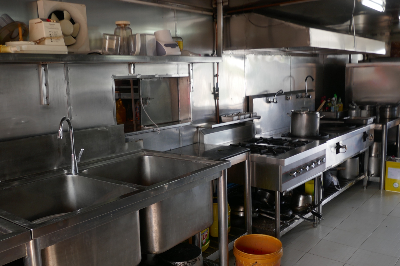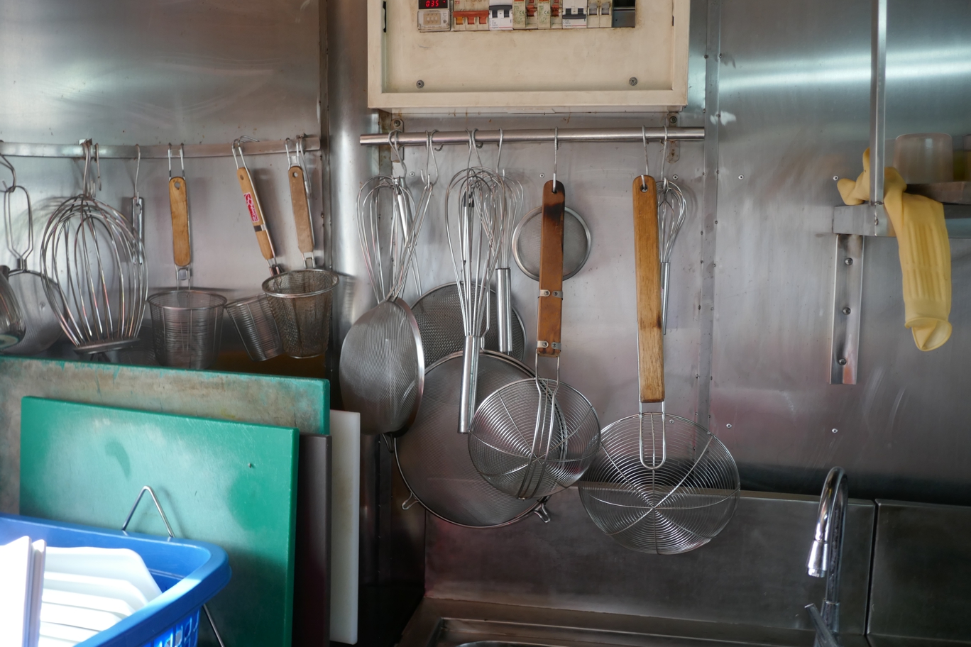 Als eine der Frauen merkt, dass ich mir die Küche ansehe, kommt das Signal, dass ich kurz warten solle, mit Blick auf eine Durchreiche – sicherlich ins Restaurant. Sie ist weg, nach kurzer Zeit geht die Durchreiche auf, sie winkt wie im Kasperle-Theater durch – und zeigt mir eine Richtung, wie ich weitergehen soll. Es geht eine halbe Treppe hoch, ins Restaurant. Sie sitzt in einer etwas verborgenen Nische auf dem Boden, und blickt durch die Durchreiche in die ebenenversetzte Küche hinunter.