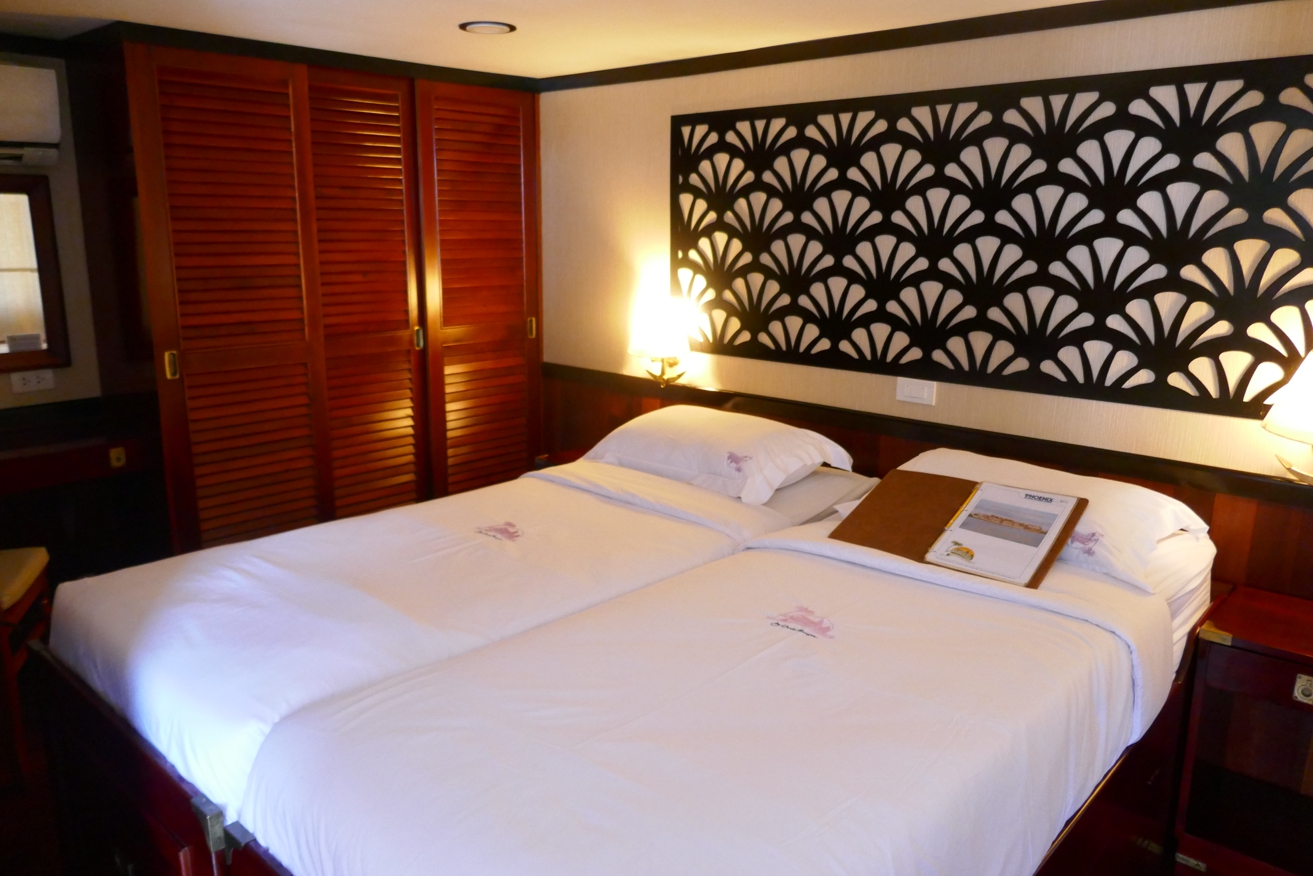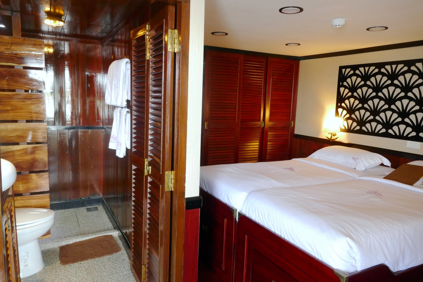 Bei Ankunft werden wir sehr freundlich von der Crew in Empfang genommen und zur Kabine gebracht. Unsere Kabine ist für ein Fluss-Kreuzfahrtschiff überraschend groß, sehr stilvoll ausgestattet mit Holz – die Böden, die Möbel, die Wandvertäfelung, sogar das ganze Bad in dunklem, angenehmem Echtholz; ansonsten alles hell. Großes Doppelbett in der Kabine, Schrank, kleiner Schreibtisch, Nachtkästchen, Stuhl – einer mehr wäre nicht schlecht. Das Bad gut aufgeteilt, auch alles drin. Insgesamt eine wirklich angenehme Atmosphäre, ein netter eigener kleiner Bereich auf dem Schiff. Und was sich auf der Reise bei Temperaturen von immer über 30 Grad und enorm hoher Luftfeuchtigkeit als sehr angenehm bewähren wird: Eine gut regelbare Klimaanlage.