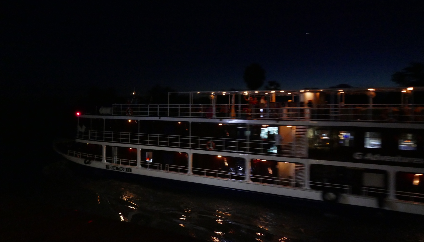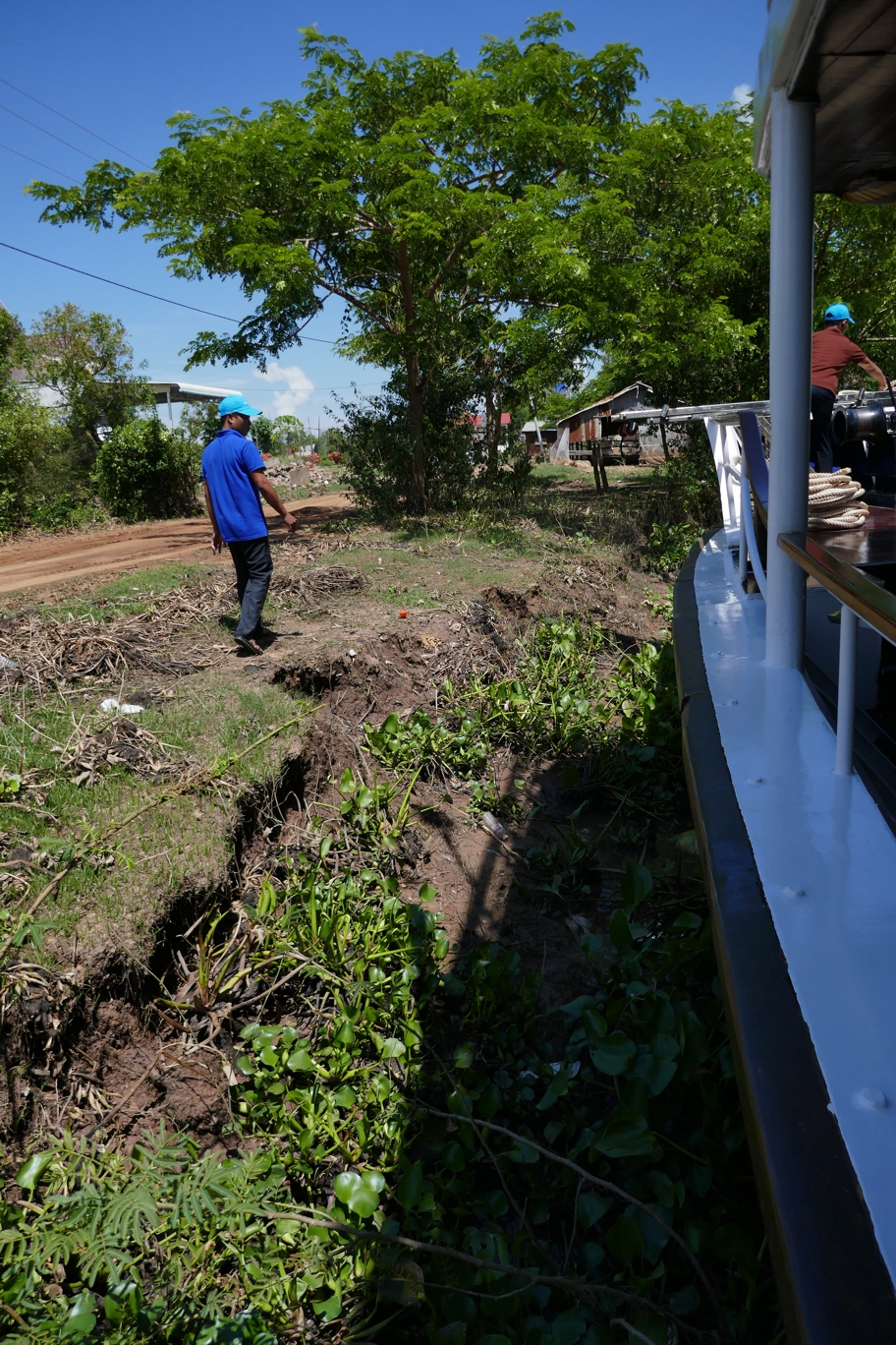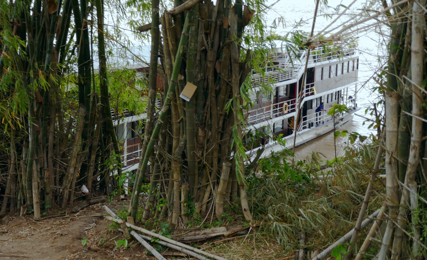 Verwunderlich ist uns das nach der Fahrt nicht mehr. Erstaunlich nahe geht es oft an kleinen Booten, anderen Schiffen oder am Ufer vorbei. Öfters tauchen Sandbänke auf oder muss man von ziemlich niedrigem Wasserstand ausgehen, wenn Menschen oder Tiere weit im Fluss stehen. Fast abenteuerlich ist es dann, wenn für einen Aufenthalt nicht an einem Anleger angehalten wird, sondern das Schiff mehr oder weniger in die Böschung am Ufer gefahren und dort festgemacht wird.