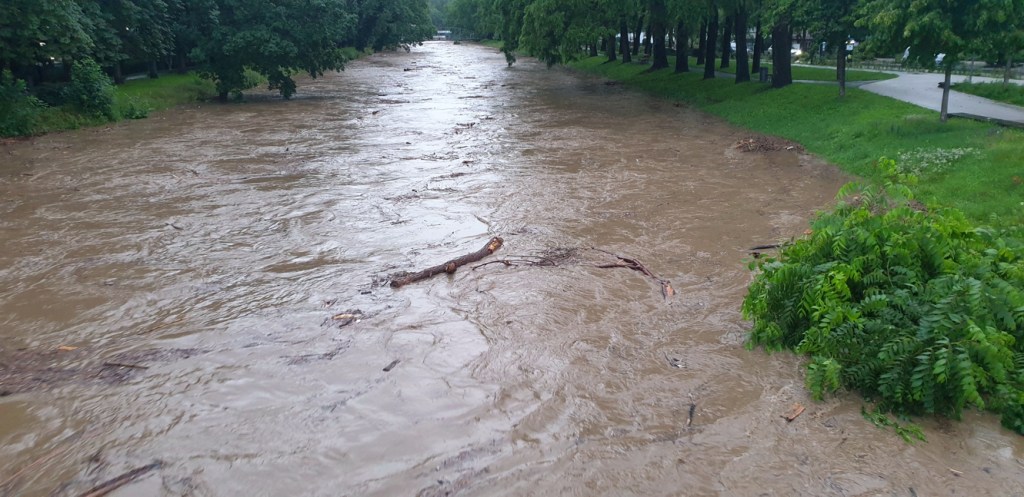 Direkt beim Kursaal führt eine kleine Fußgängerbrücke über den sonst schmalen Fluss mit ziemlich niedrigem Wasserstand – und wir wundern uns, dass das Wasser bis knapp unter die Brücke reicht, die schon Schwemmholz sammelt.