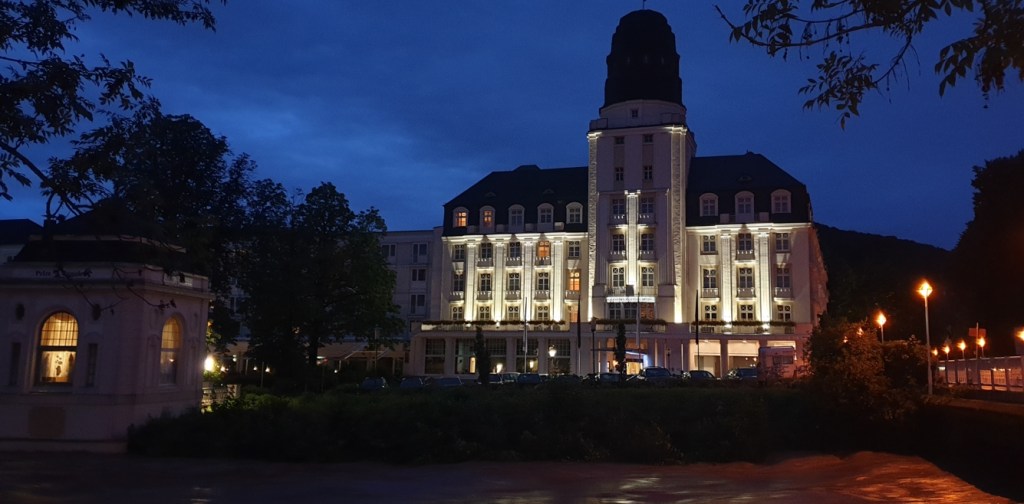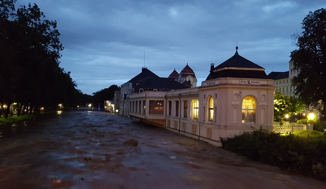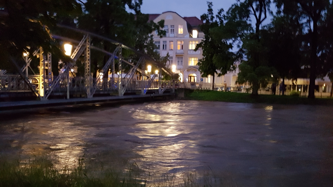 Zurück geht es über die Kurgartenbrücke, gegen die einige Baumstämme regelrecht donnern; das Hotel nebenan ist noch festlich beleuchtet.