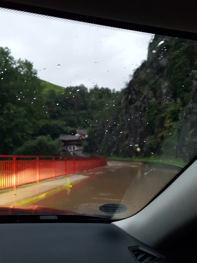 Kurz nach Walporzheim, bevor es in die Kurve um die „Bunte Kuh“ geht – einem so benannten markanten Felsen – werden wir von einem Kleintransporter, der sich fast quer zur Straße stellt und die Warnblinker einstellt, ausgebremst. Wir staunen, denken an einen Verkehrsunfall hinter der unübersichtlichen Kurve, sehen aber dann beim Wenden unseres Fahrzeugs, dass schon direkt hinter dem Felsen die Straße schon so viel unter Wasser steht, dass die Straße nicht mehr passierbar ist. Ohne Warnung und schwungvoll gefahren – dann wären wir schon mitten im Wasser gestanden.