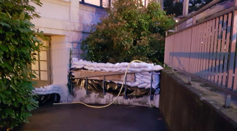 Schnell zurück nach Hause. An der Brücke sehen wir, dass inzwischen Sandsäcke aufgestapelt sind. Das Auto wollen wir auf keinen Fall in die Tiefgarage stellen – und diskutieren noch, ob man es nur auf den Parkplatz nebenan stellen sollte, oder ein Stück weiter oben an den Hang. Schließlich die Entscheidung: Parkplatz vor dem Haus. Selbst wenn die Ahr über die Ufer treten sollte, dann sollten sich bei diesem kleinen Fluss nur ein paar Zentimeter, eher Pfützen ergeben, kein Vergleich zu dem, was man vom Rhein kennt – schließlich ist auch hier bei Neuenahr ist das Tal flach und viele hundert Meter breit und es gibt unzählige Tiefgaragen. Glatte Fehleinschätzung.