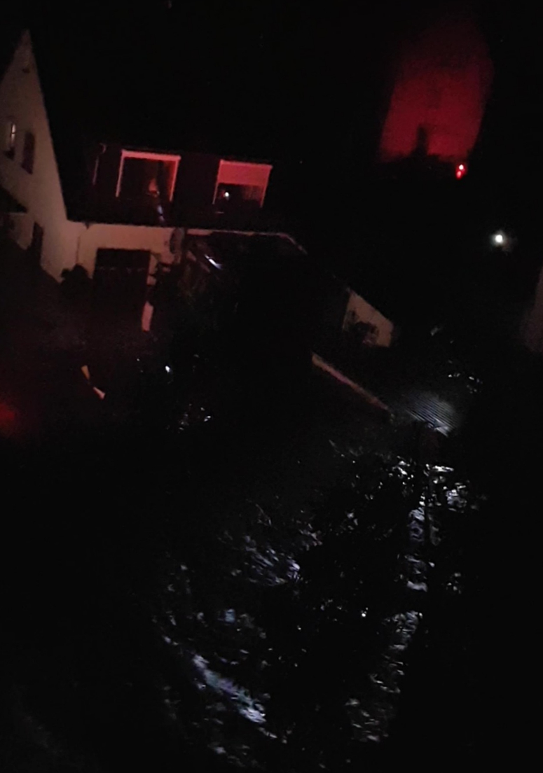 Irgendwann gegen Mitternacht wachen wir auf. Draußen ist ein Geräusch nach fließendem Wasser zu hören, das wir so nicht kennen, auch nichts mit heftigem Regen zu tun hat. Ein reißender Fluss ist laut – und wir staunen, dass die Ahr eine solche Lautstärke erreichen kann, die man bis zu uns hören kann. Wir wohnen auf der vierten Etage, eigentlich mit schönster Aussicht auf die Stadt, vor uns die Ahrtherme. Von Küche und Esszimmer sehen wir direkt hinunter auf die kleine Wohnstraße, auf der sich eher Rinnsale wie bei Starkregen gebildet haben.
