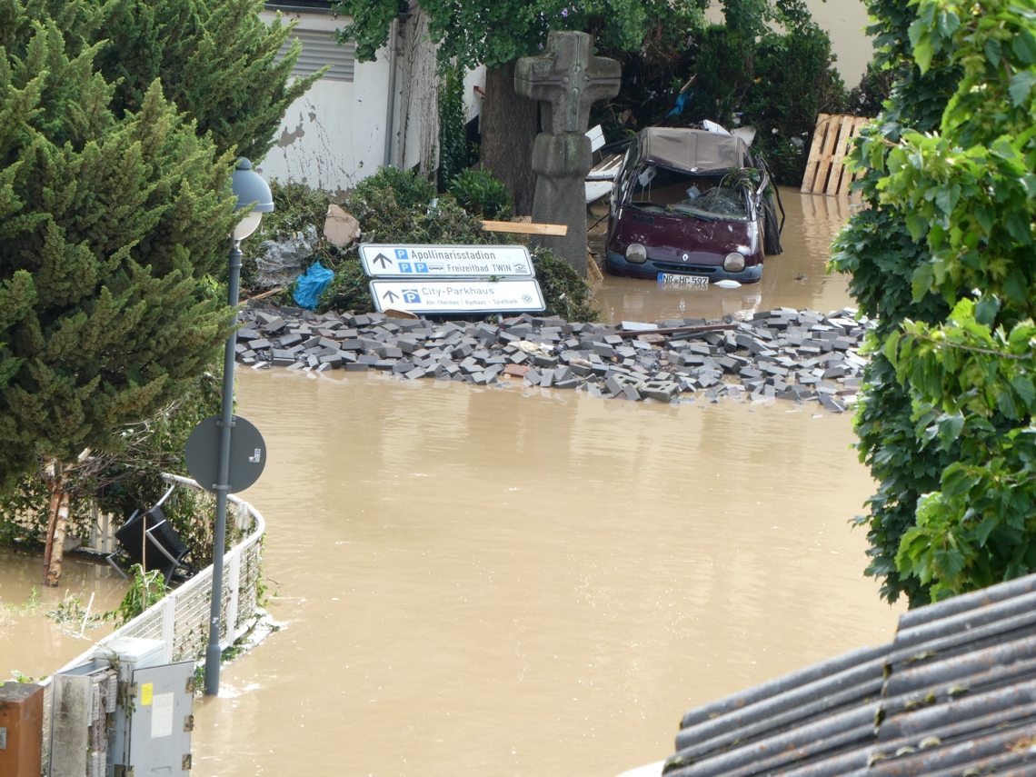 Die Liegewiese der Ahrtherme und auch der Garten des Nachbarn sind zum See geworden. Bei uns kann der untere Teil des Treppenhauses nur mit Mühe begangen werden; alles ist schlammig und rutschig. An der Einfahrt zur Tiefgarage ist zu sehen, dass diese auch noch auf halbe Höhe unter Wasser steht. Von oben sieht das Flachdach der außen liegenden Tiefgarage aus wie ein gefülltes Schwimmbecken. Da die Umrandung höher ist als die Dachfläche, haben die Wassermassen einfach alles aufgefüllt, und die Abflüsse sind längst vom Schlamm verschlossen.
