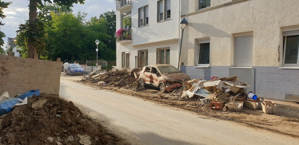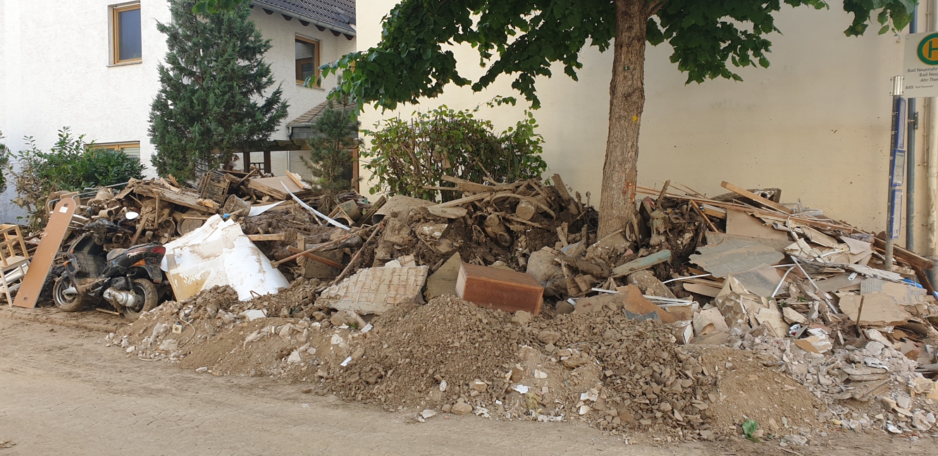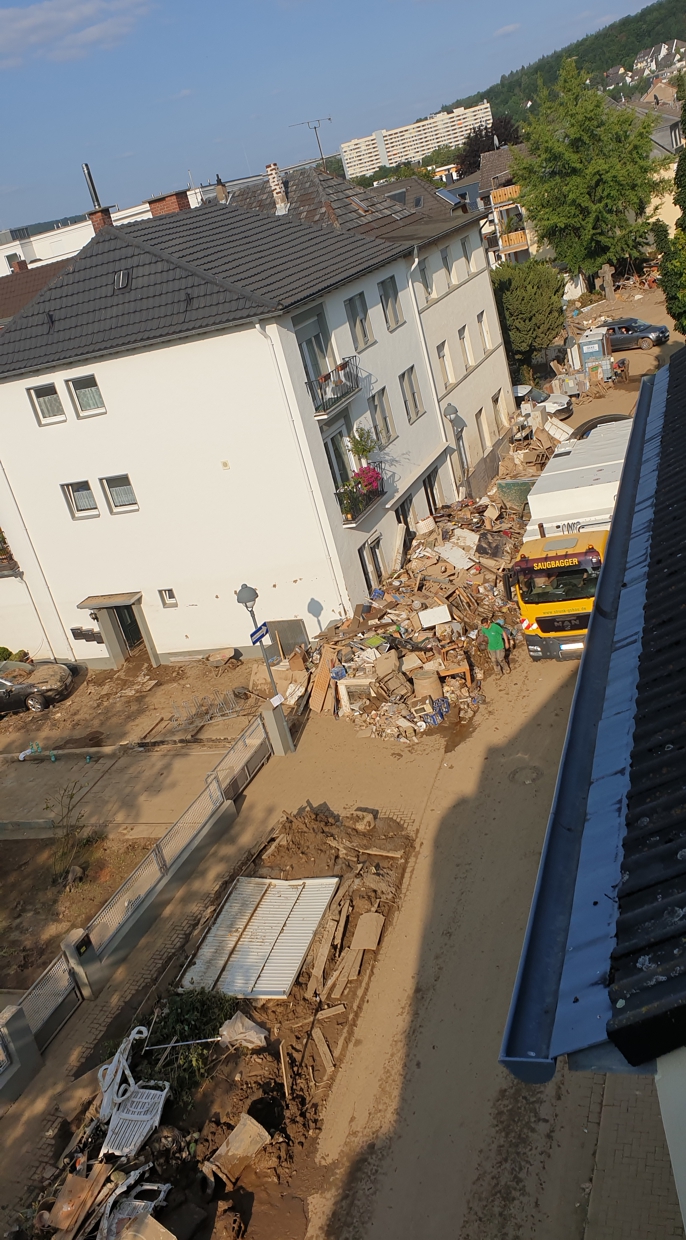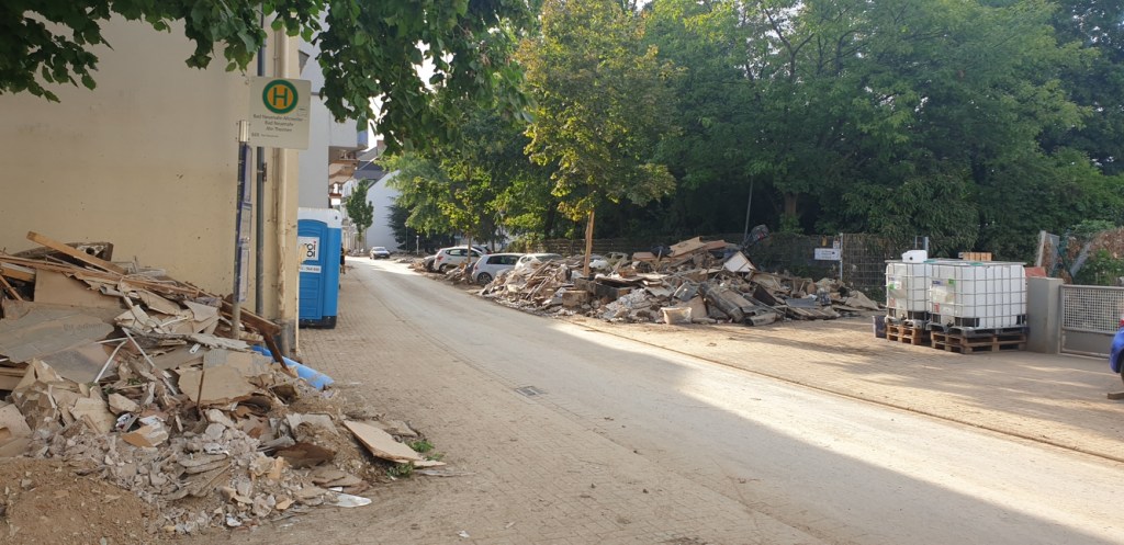 Wir waren immer begeistert von unserem Ausblick auf Bad Neuenahr. Ein weiter Blick über die kleine Stadt, das Tal abgegrenzt von den nahen Weinbergen, direkt vor uns die Ahrtherme. Jetzt zeigt sich uns weit und breit nur eine solch umfassende Zerstörung, dass man gar nicht glauben mag, dass hier mal eine lebenswerte Kleinstadt war und eine solche irgendwann wieder entstehen könnte. Die Straßen sind voll mit all dem, was aus den Häusern entsorgt werden musste.