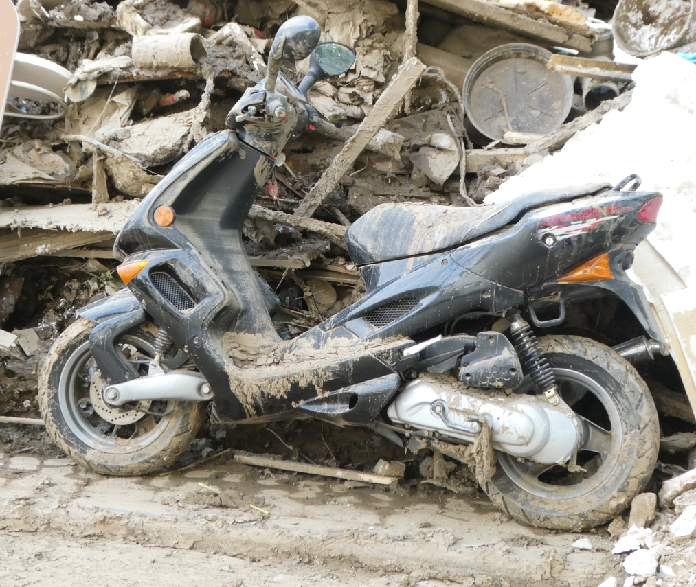 Etwas mehr als eine Woche ist es her, seit die Flutwellen durch die Stadt gelaufen sind. Wo man hinsieht, sind die Häuser verwüstet, bis weit hinauf nass und mit Schlamm bespritzt, Fenster und Türen herausgerissen. Einige Häuser sind bereits abgerissen. Die Luft ist stickig und modrig, gewürzt mit den Abgasen der Räumfahrzeuge und dem, was Kanalisation und Ölheizungen auch auf der Straße hinterlassen haben.