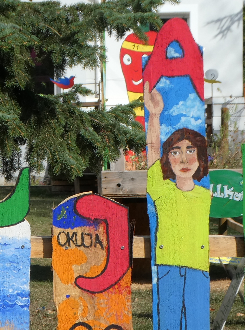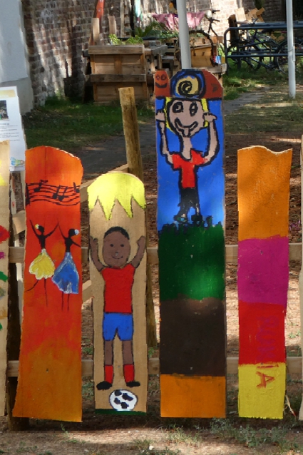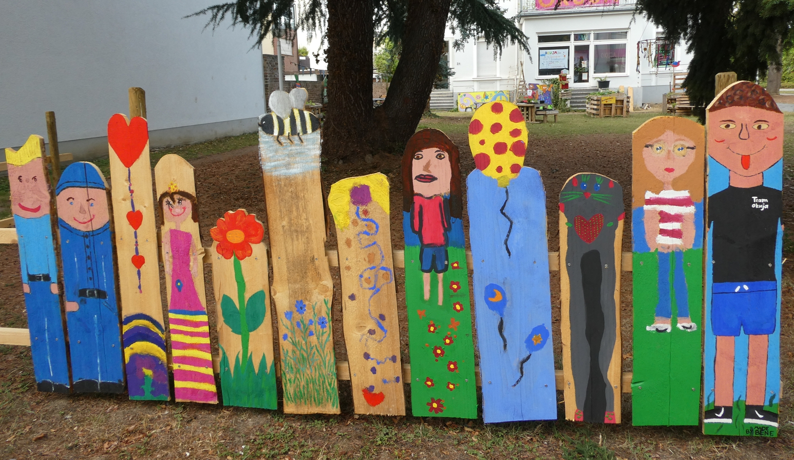 So ein wenig den Zukunftsbedarf und Zukunftshoffnung strahlt auch der Zaun des OKUJA, von dem einige Fotos in diesen Text eingebaut sind, gemalt von Kindern und Jugendlichen der Offenen Kinder- und Jugendarbeit aus, deren Gebäude ganz in der Nähe unserer Wohnung stand – jetzt auch weggeschwemmt, und eher nebenbei fotografiert, nur wenige Wochen vor der Flut.