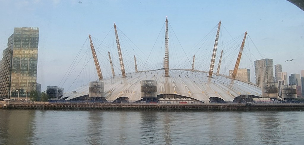 Über den Fluss führt die städtische Seilbahn, die Emirates Air Line Cable Car. In einer Flussschleife liegt wie eine riesige flache Kuppel die O2-Arena, der größte Kuppelbau der Welt, überragt von den spitzig herausragenden Stahlgerüsten – ein Gebäude mit Symbolmaßen, 365 Meter Durchmesser, 52 Meter Höhe, aufgehängt an 12 Masten. In der Nähe von Greenwich dominieren bereits die ersten Hochhauslandschaften.