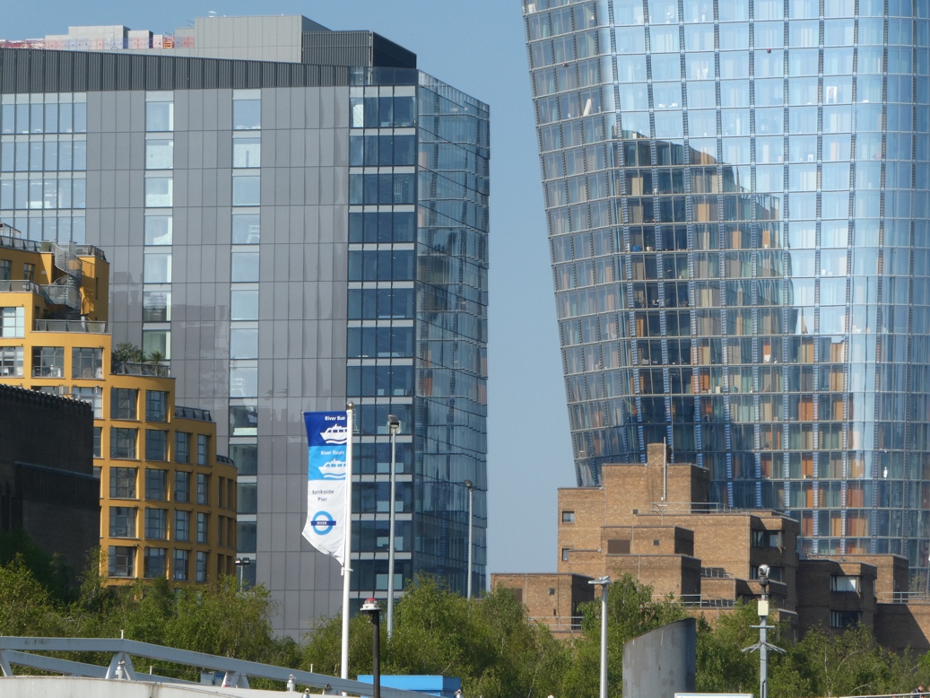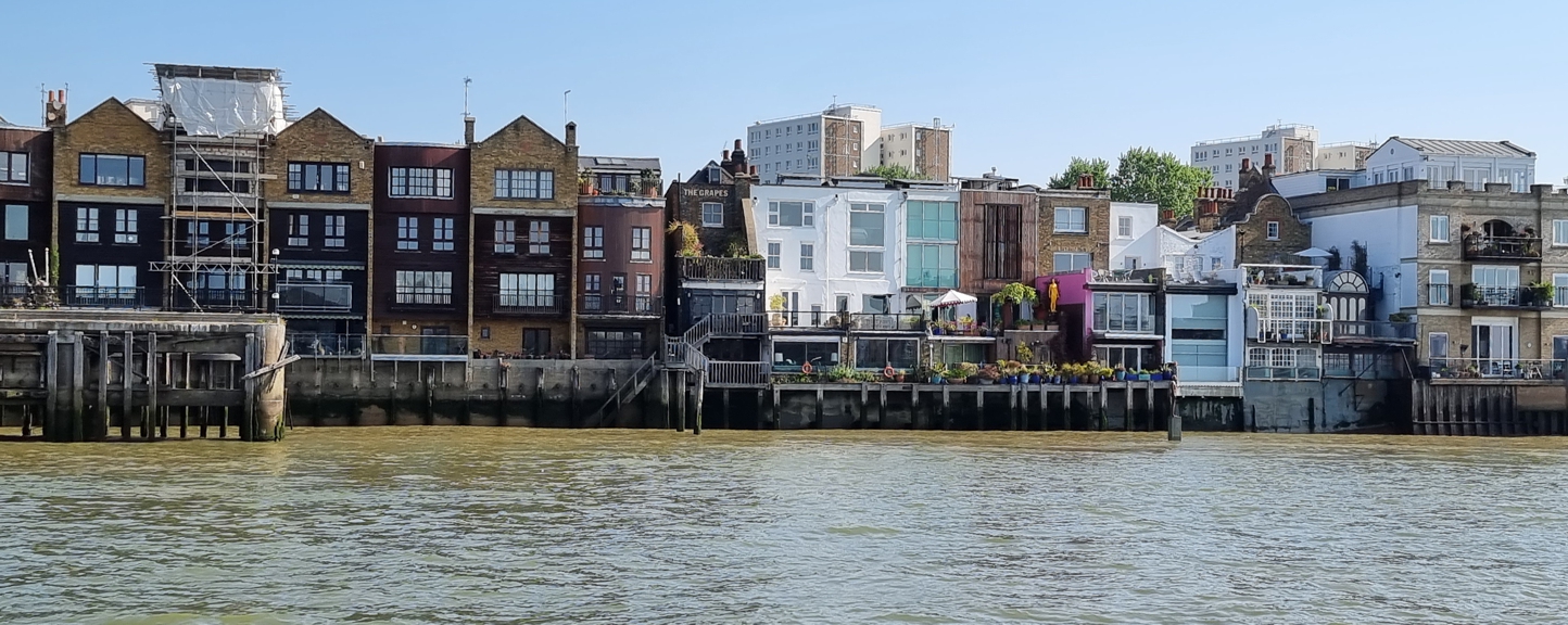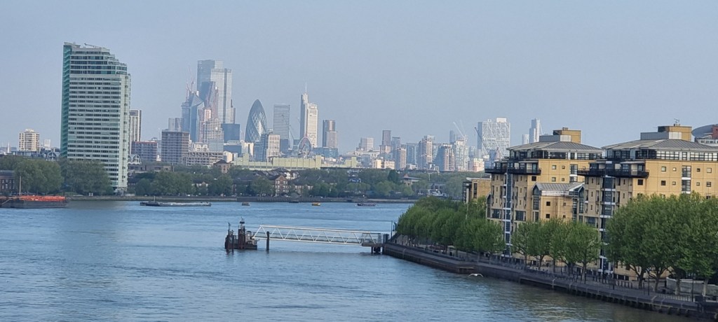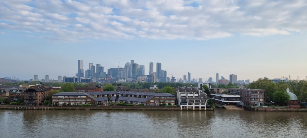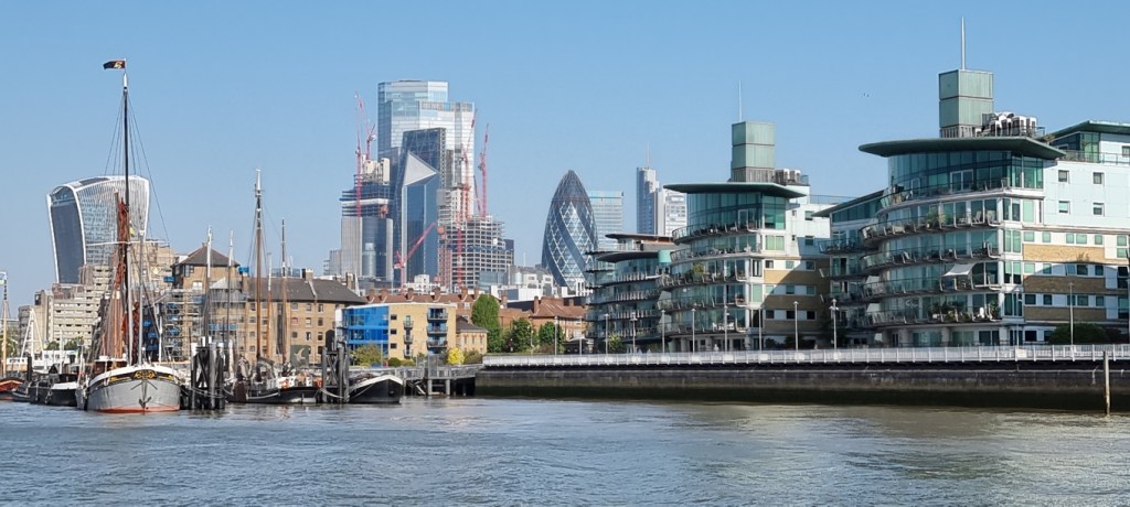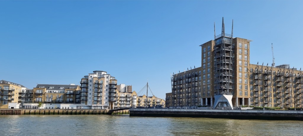 Entlang des Flusses sind alte Dockanlagen zu sehen, moderne Wohnhäuser, für Wohnzwecke umgebaute Fabrikanlagen, zwischendurch immer wieder einige eher traditionelle Wohngebäude, wie man sie in England erwartet. In der Ferne zeigt sich die Skyline von London. Die lange Zeit dominierende, berühmte Hochhauszigarre mit dem offiziellen Namen 30 St Mary Axe, gerne auch The Gherkin, also Gewürzgurke genannt, fällt nur noch bedingt durch ihre besondere Form inmitten inzwischen weit höherer Gebäude auf.