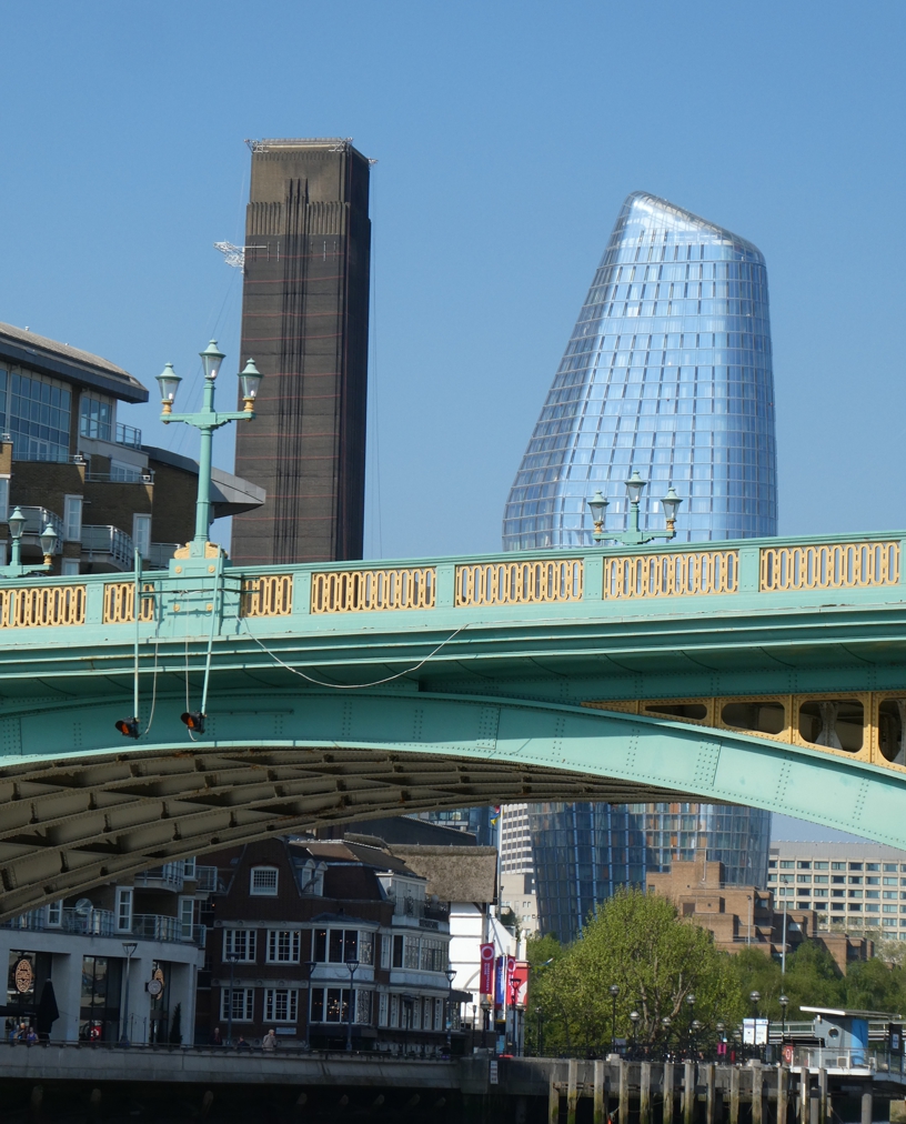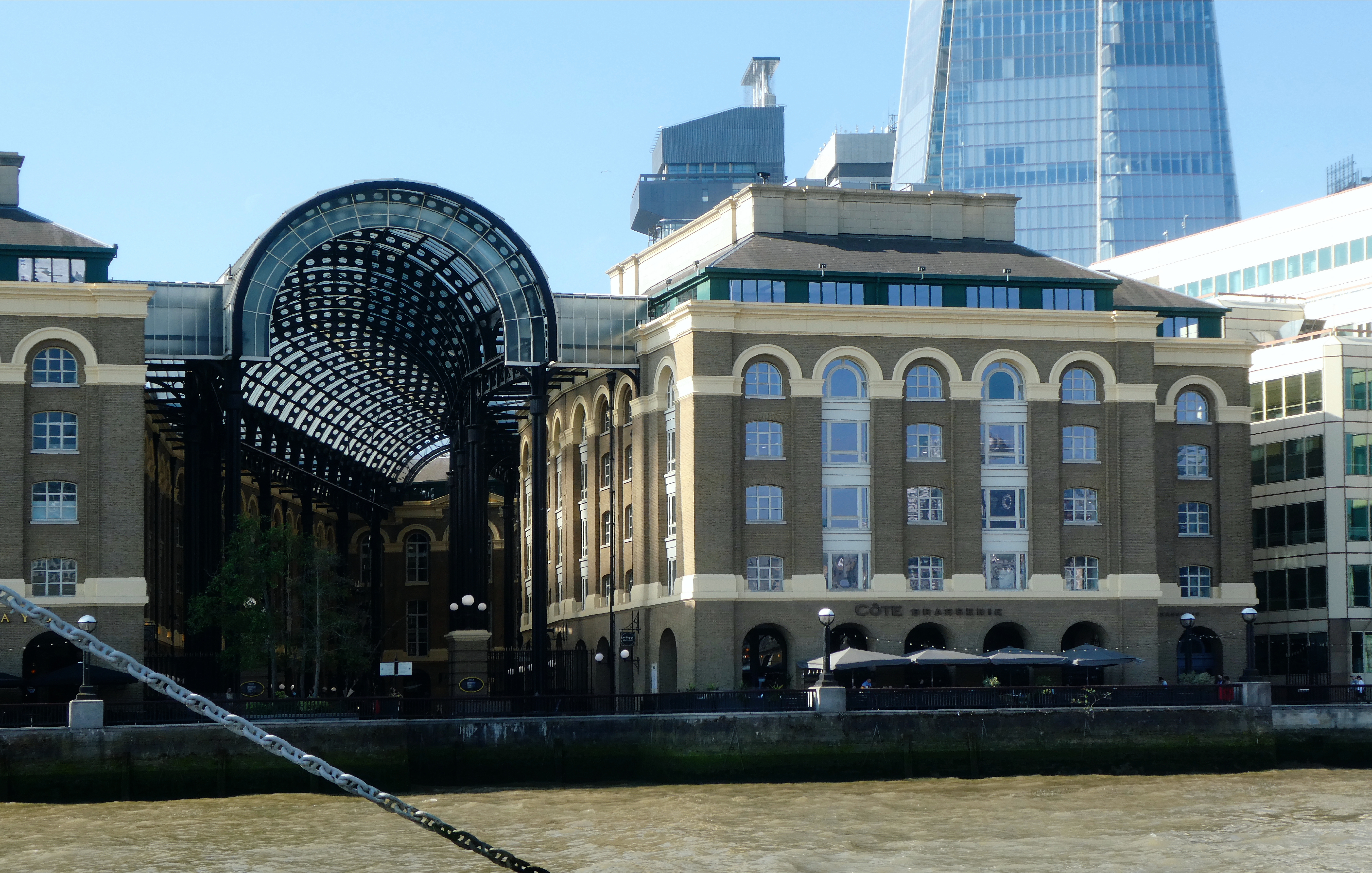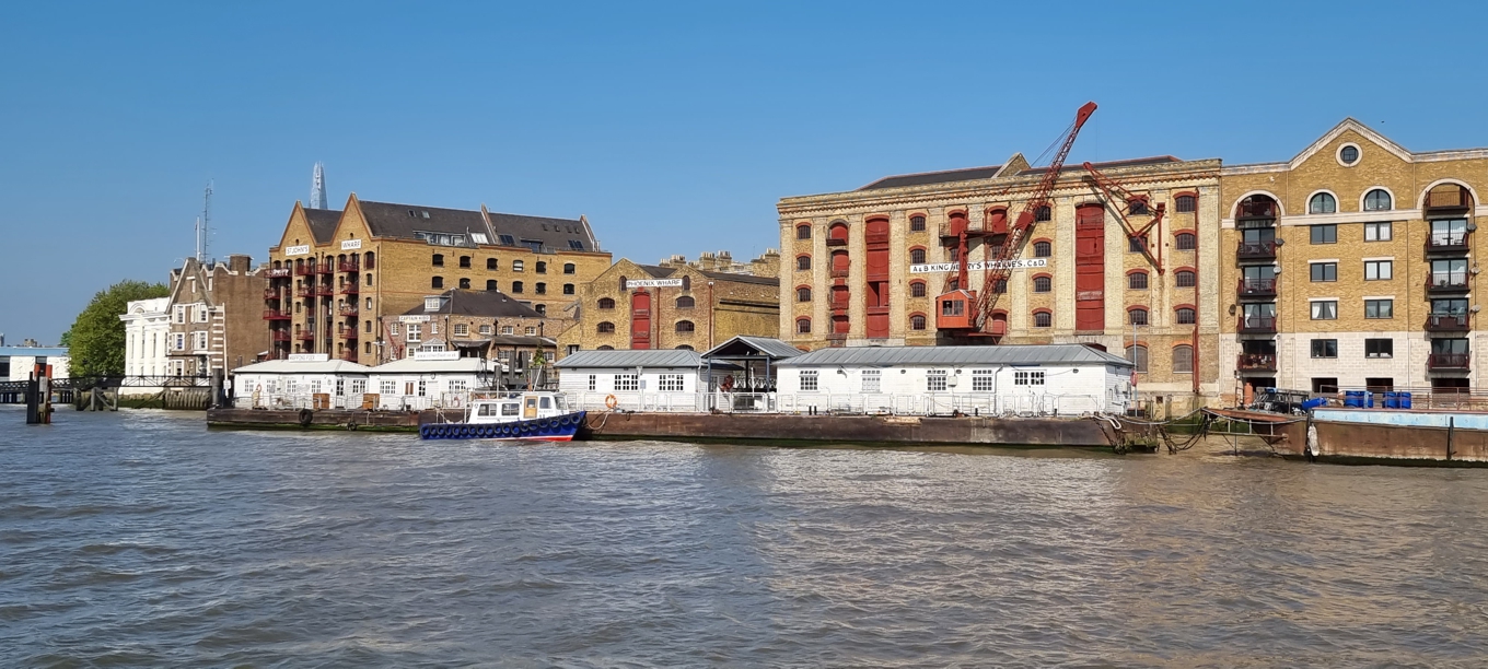 Entlang des Flusses sind alte Dockanlagen zu sehen, moderne Wohnhäuser, für Wohnzwecke umgebaute Fabrikanlagen, zwischendurch immer wieder einige eher traditionelle Wohngebäude, wie man sie in England erwartet. In der Ferne zeigt sich die Skyline von London. Die lange Zeit dominierende, berühmte Hochhauszigarre mit dem offiziellen Namen 30 St Mary Axe, gerne auch The Gherkin, also Gewürzgurke genannt, fällt nur noch bedingt durch ihre besondere Form inmitten inzwischen weit höherer Gebäude auf.