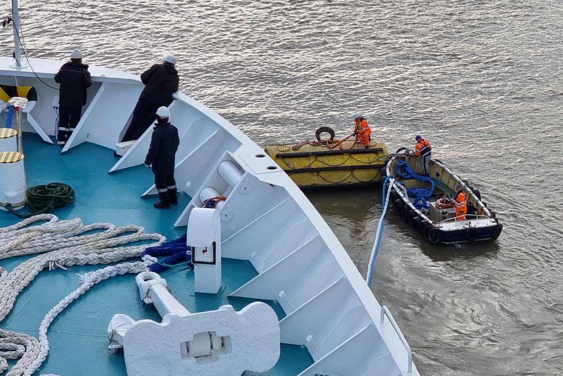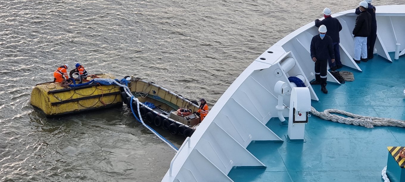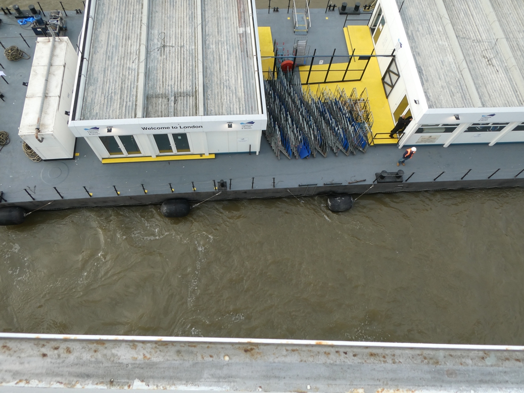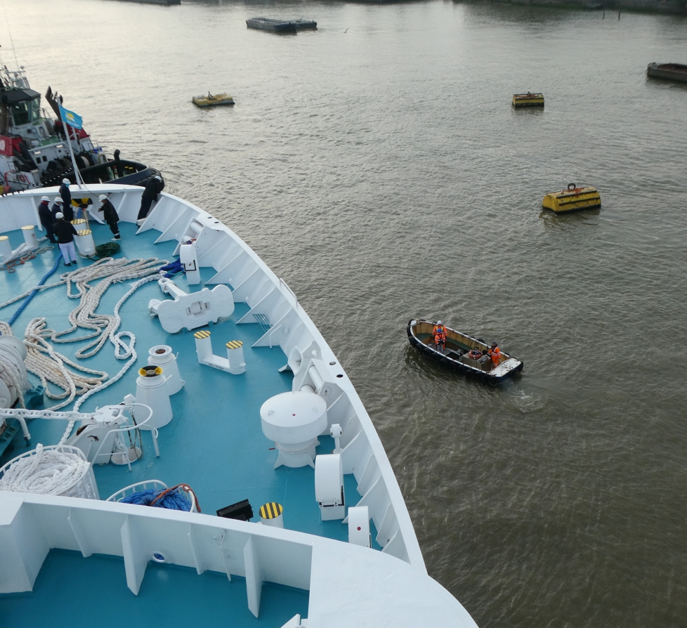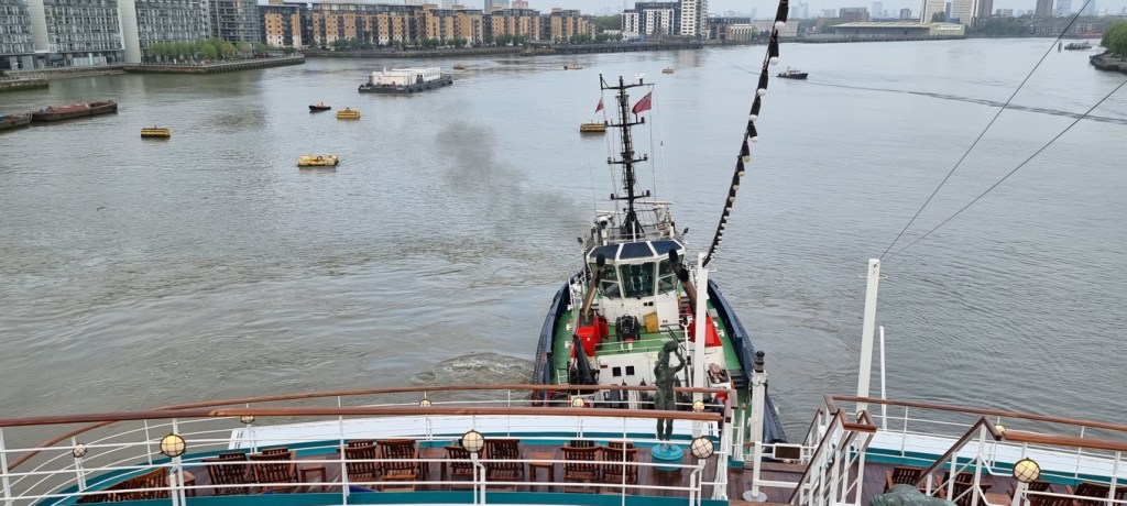 Unser Schiff wird verankert – und zwar mitten in der Themse. Ein höchst ungewöhnlicher Liegeplatz für ein Hochseeschiff. Staunend schauen wir zu, wie das Schiff zunächst von zwei Schleppern gehalten und fixiert wird. Dann kommen Boote, die mit vom Schiff zugeworfenen Seilen dieses an den im Fluss liegenden Festmachern so verzurren, dass es von der Flussströmung nicht abgetrieben werden kann. Es ist schon ein besonderes Erlebnis – solch skurrile Ideen können eigentlich nur in England entstehen.