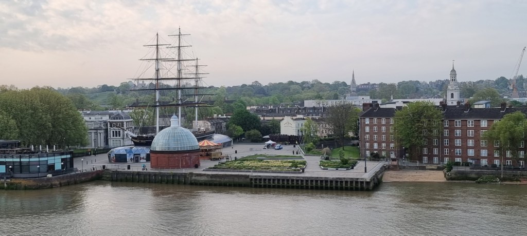 Die MS Deutschland hält direkt am Stadtzentrum von Greenwich, direkt beim auf dem Ufer aufgelegten Segler Cutty Sark, einem Tee- und Wollklipper, in Dienst gestellt 1869, einst eines der schnellsten Segelschiffe, jetzt ein Museumsschiff. Davor ist ein Kuppelgebäude zu sehen – hier geht es hinunter zum alten Themsetunnel aus dem Jahr 1902, dem etwa 370 Meter langen Fußgängerweg unter dem Fluss hindurch, auf die andere Seite.