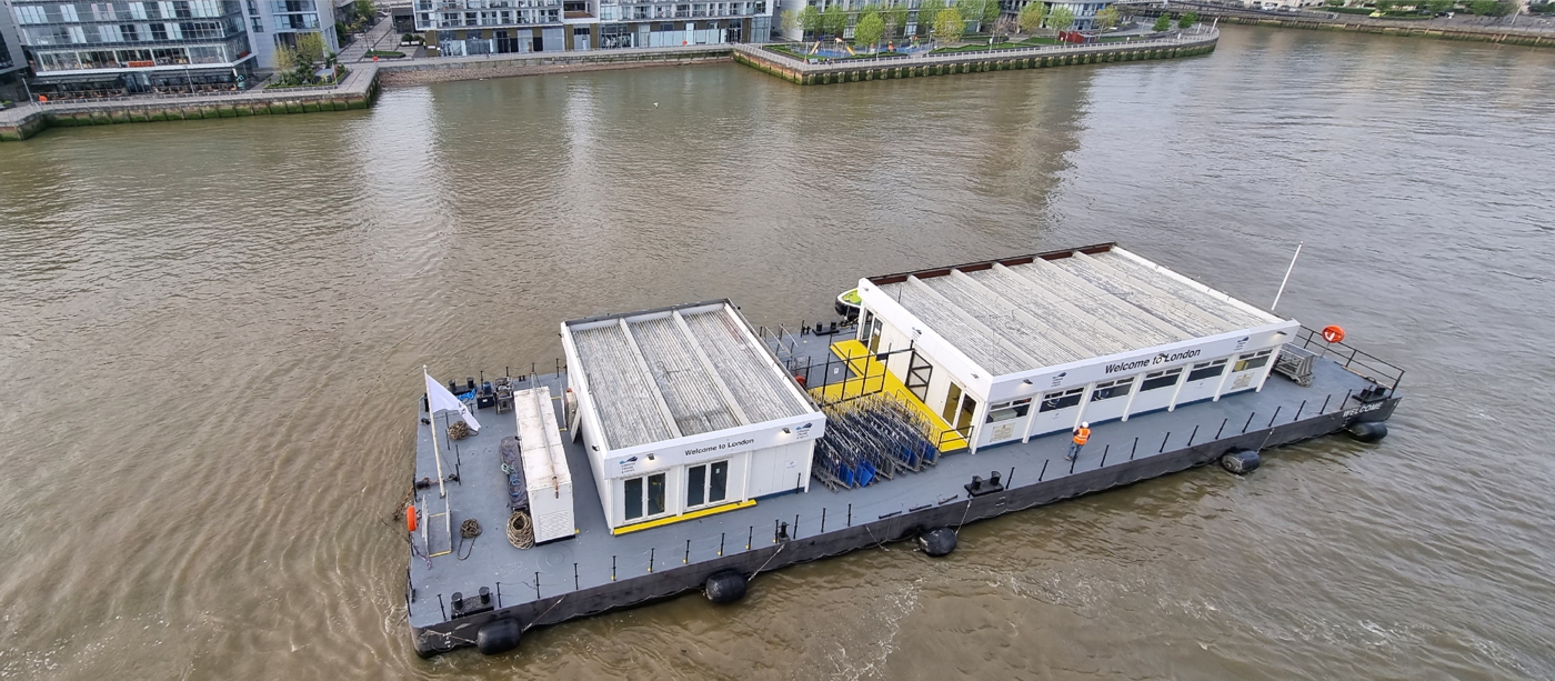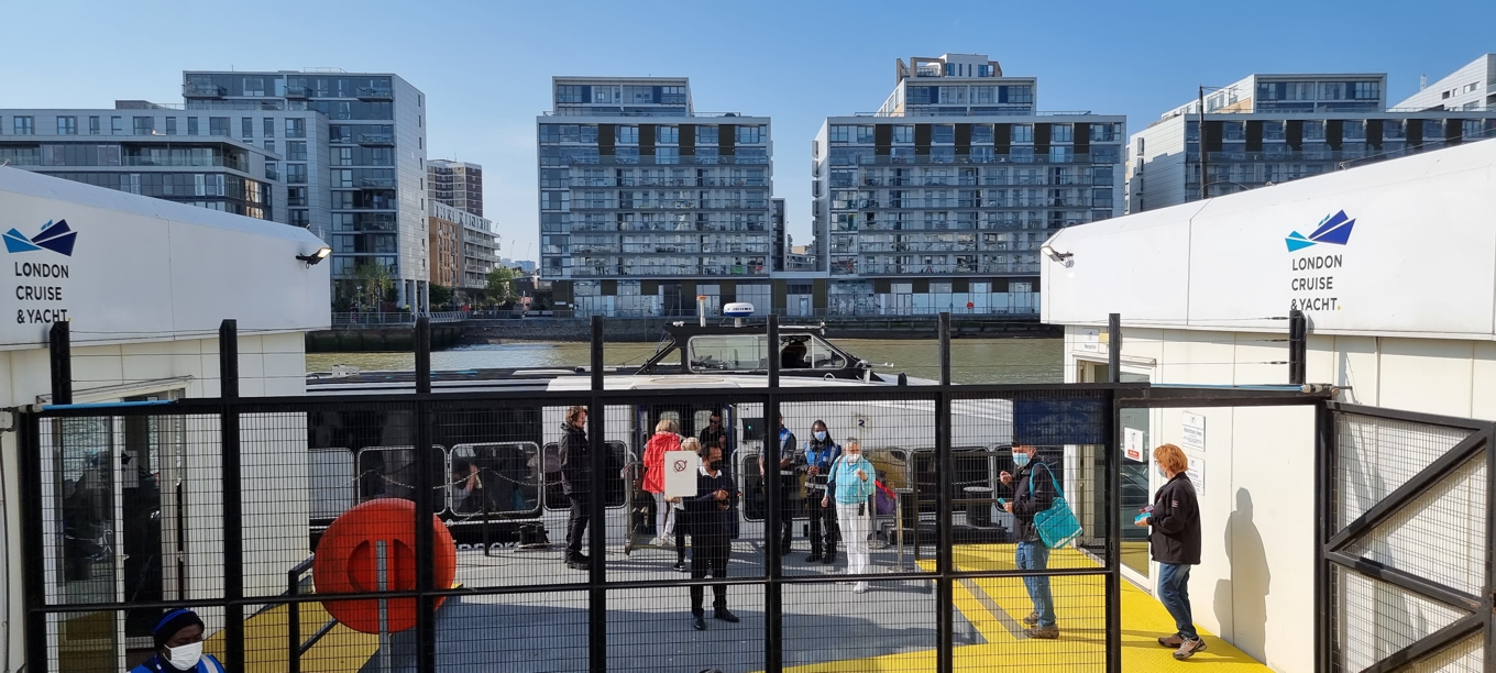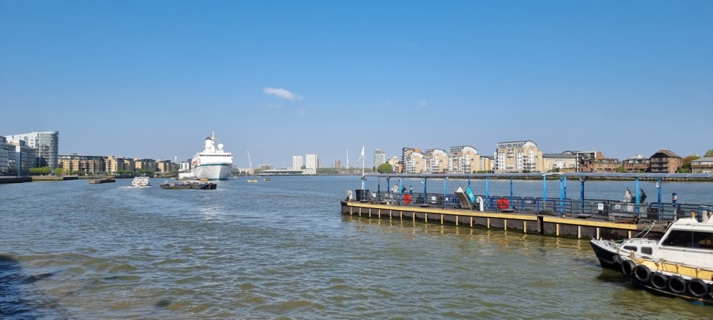 Aus dem diffusen Morgenlicht ist inzwischen ein strahlend blauer Himmel geworden. Noch warten wir auf die Schiffsfreigabe durch die Behörden. Erst dann ist der Ausstieg an Land möglich – aber nur mit Hilfsmitteln: Es kommt ein Pontonboot mit mobiler Passkontrolle und Aufschrift „Welcome in London“ angeschwommen, das am Kreuzfahrtschiff anlegt – und von diesem Pontonboot aus werden mit städtischem Tenderboot in regelmäßigen Abständen die Passagiere zwischen Schiff und Ufer hin- und hergefahren.