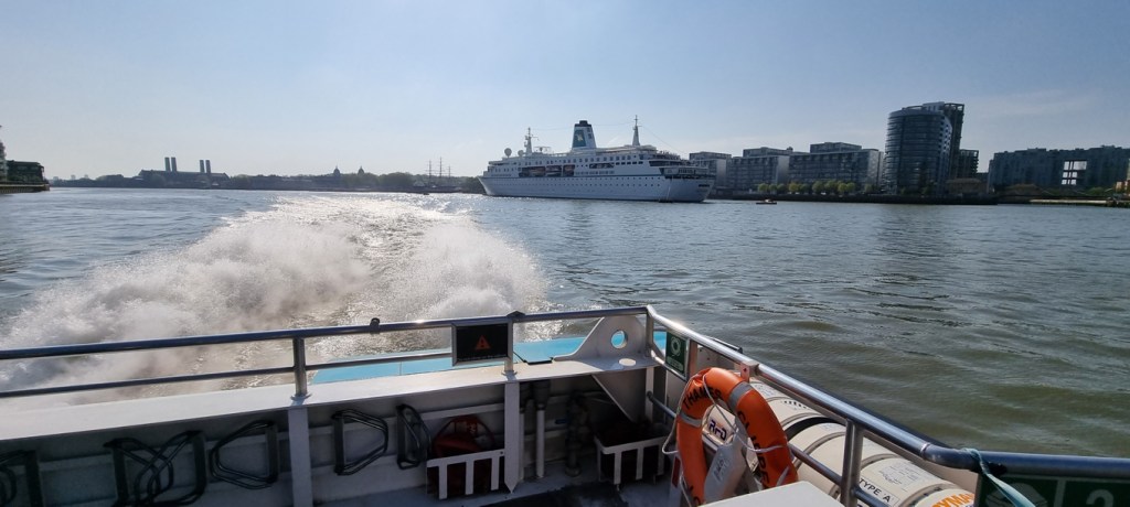 Eigentlich hatten wir ja vorgesehen, uns zunächst einmal Greenwich anzusehen, und dann vielleicht auch noch in die Innenstadt nach London zu fahren. Aber wie der Zufall es so will: Unser Tender setzt uns am Ufer ab, und direkt an der nebenliegenden Anlegestelle fährt ein Uber-Schnellboot ein. Noch ein Blick zurück zu unserem Schiff.