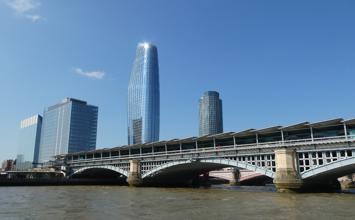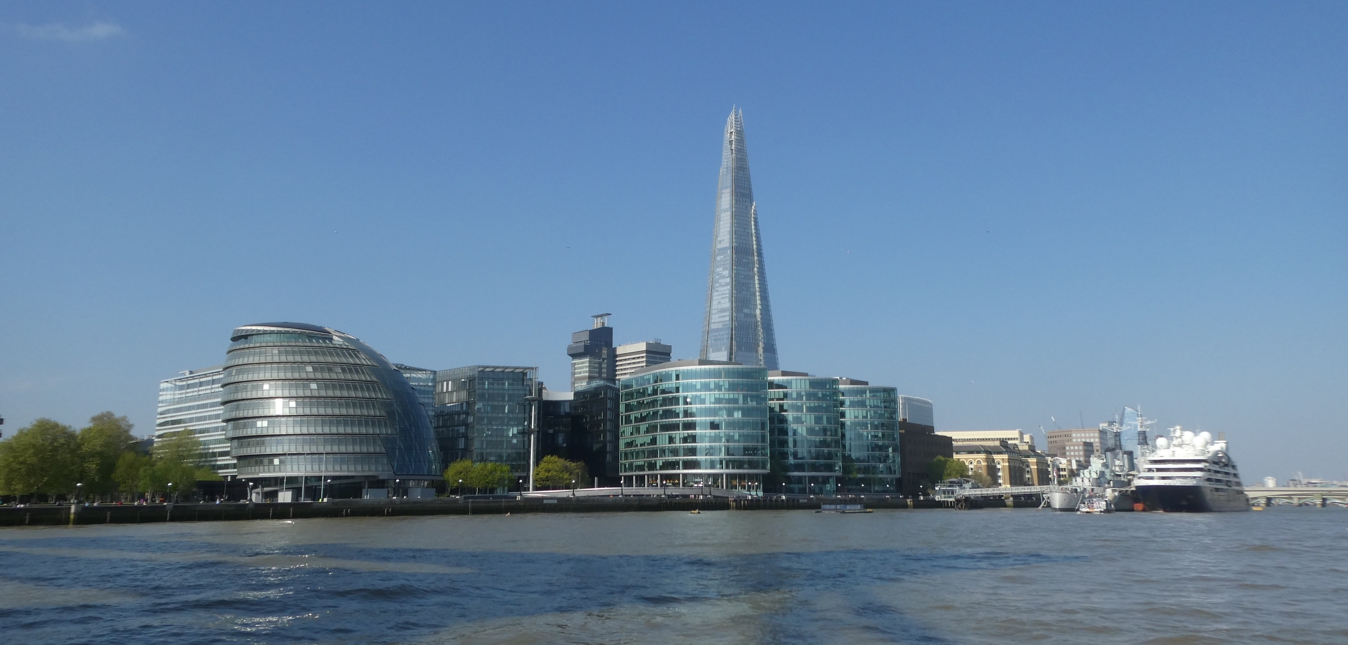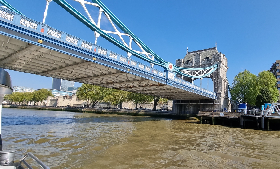 Links am Ufer steht wie eine in den Himmel ragende Spitze The Shard, lange Zeit der höchste Wolkenkratzer Europas, immerhin 310 Meter hoch. Passend irgendwie sein Name – die Glasfassade oben sieht tatsächlich aus, als habe es Glasbruch gegeben. Rasant geht es unter der Tower Bridge hindurch. Angedacht war, einmal über die Brücke zu gehen, oben auf dem Glassteg, und dabei auch die alte Brückentechnik anzusehen; aber das werden wir nachher nach vielen Kilometern Wanderung durch die Stadt nicht mehr schaffen.