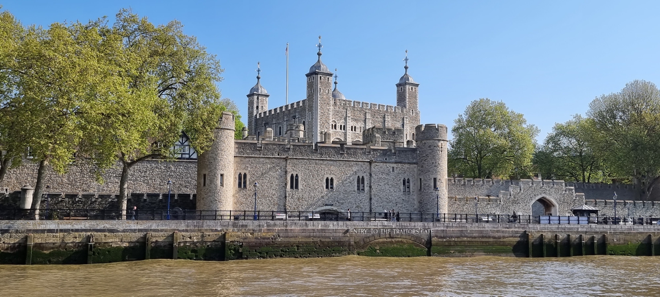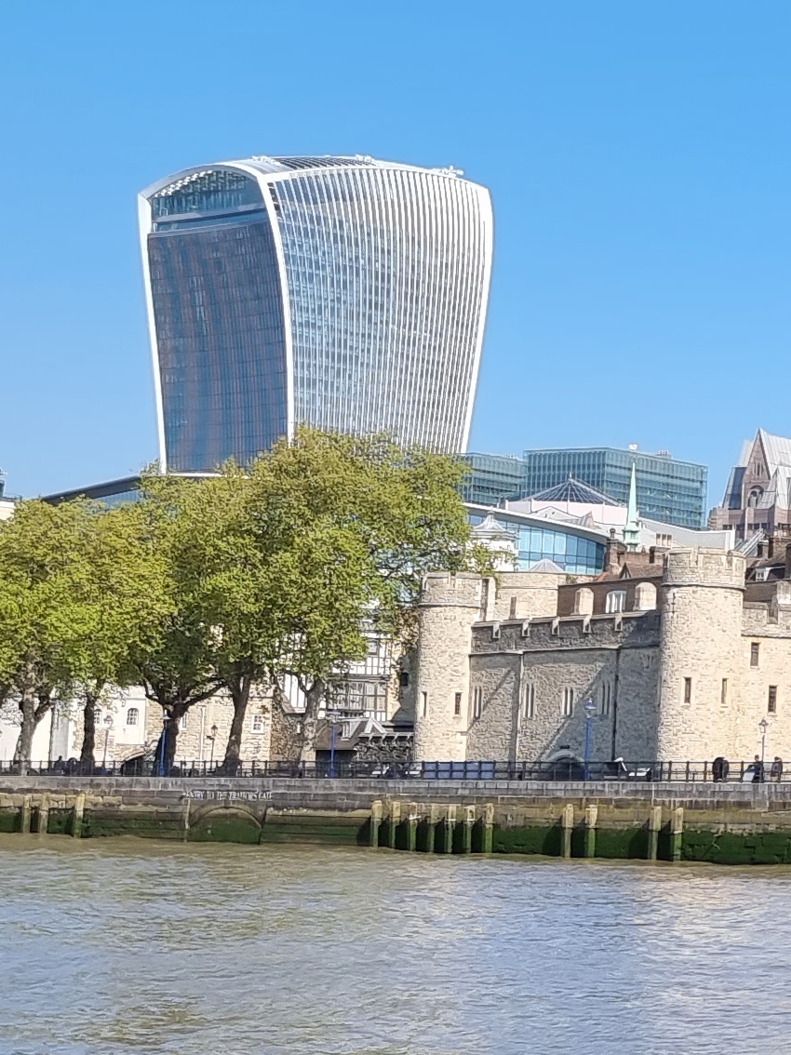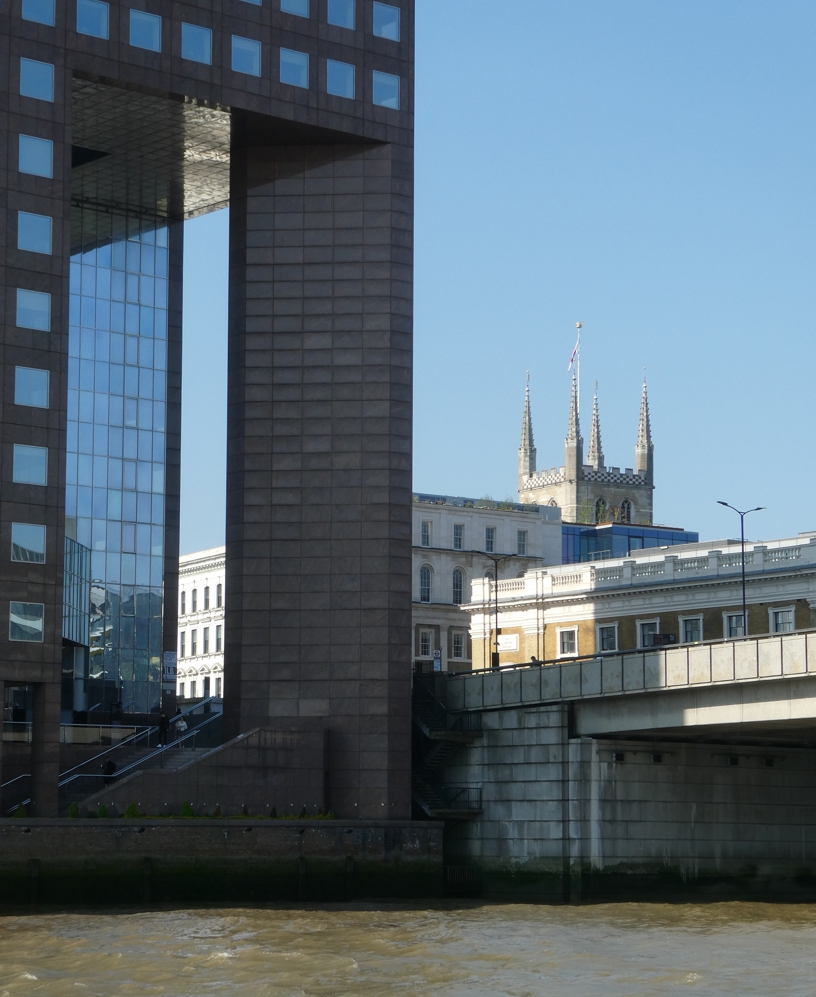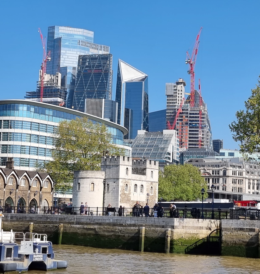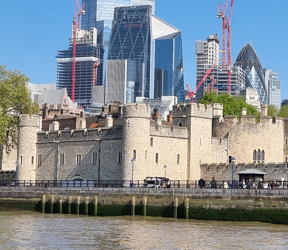 Rechtsseitig ist der Tower of London, einst mal prägnantes Wahrzeichen, jetzt inmitten der Bebauung nur noch von der Themse her auffallend, weil er direkt am Ufer steht. Wäre da nicht die Tower Bridge, würde er noch mehr einsam wirken inmitten der fast chaotischen, vor allem in die Höhe strebenden Vielfalt rundum.