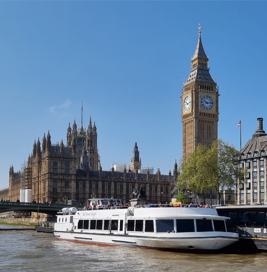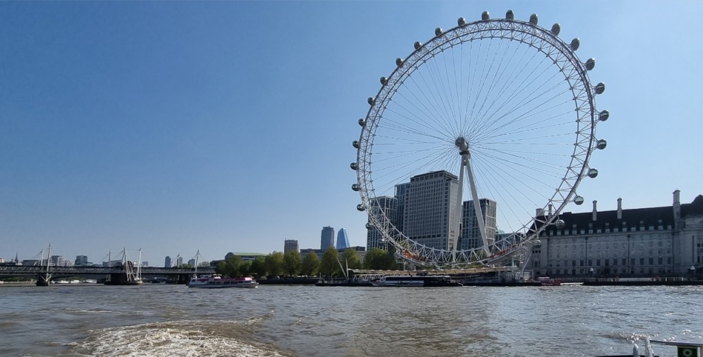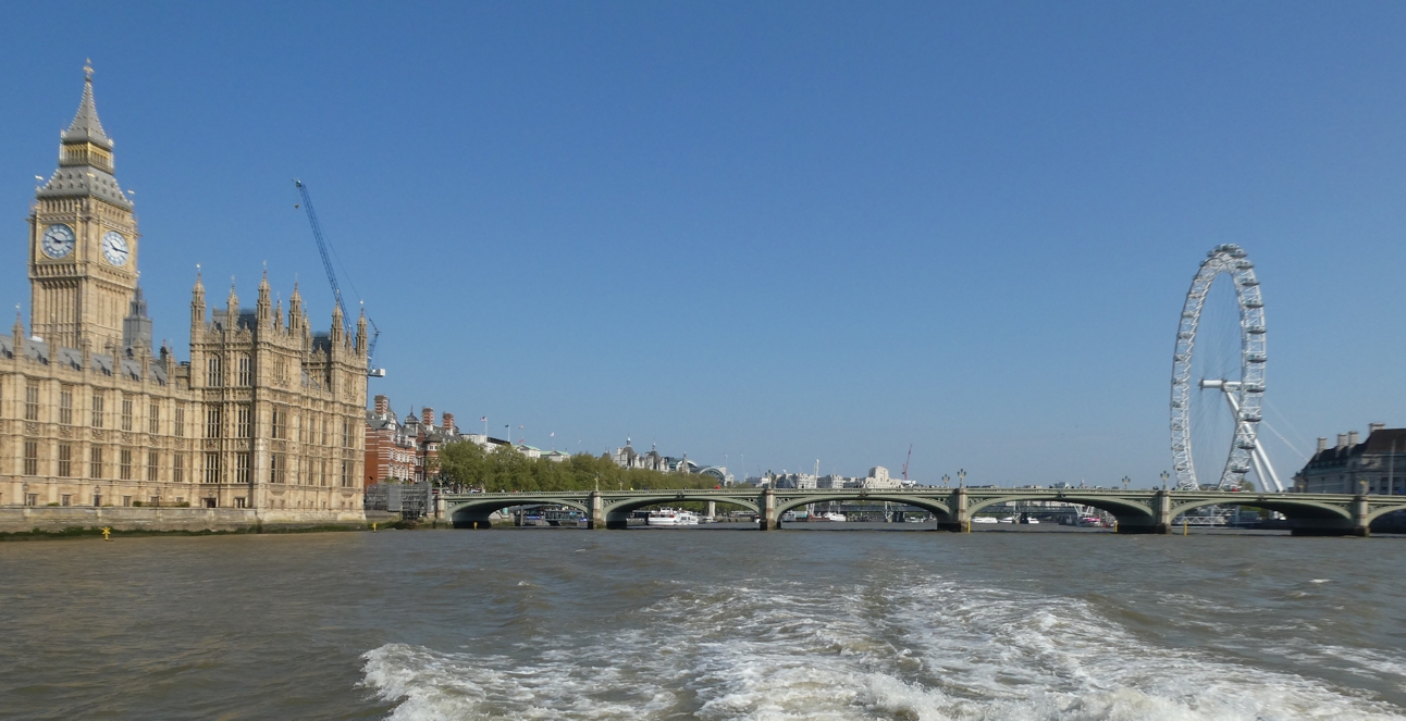 Bei Sonnenschein und tiefblauem Himmel fahren wir noch ein wenig weiter auf der Themse, nehmen dann mit dem Boot die Strecke wieder zurück bis am Parlamentsgebäude vorbei, steigen an der Westminster Bridge dann aus und machen einen „Schnelldurchgang“ durch London, zu Fuß.