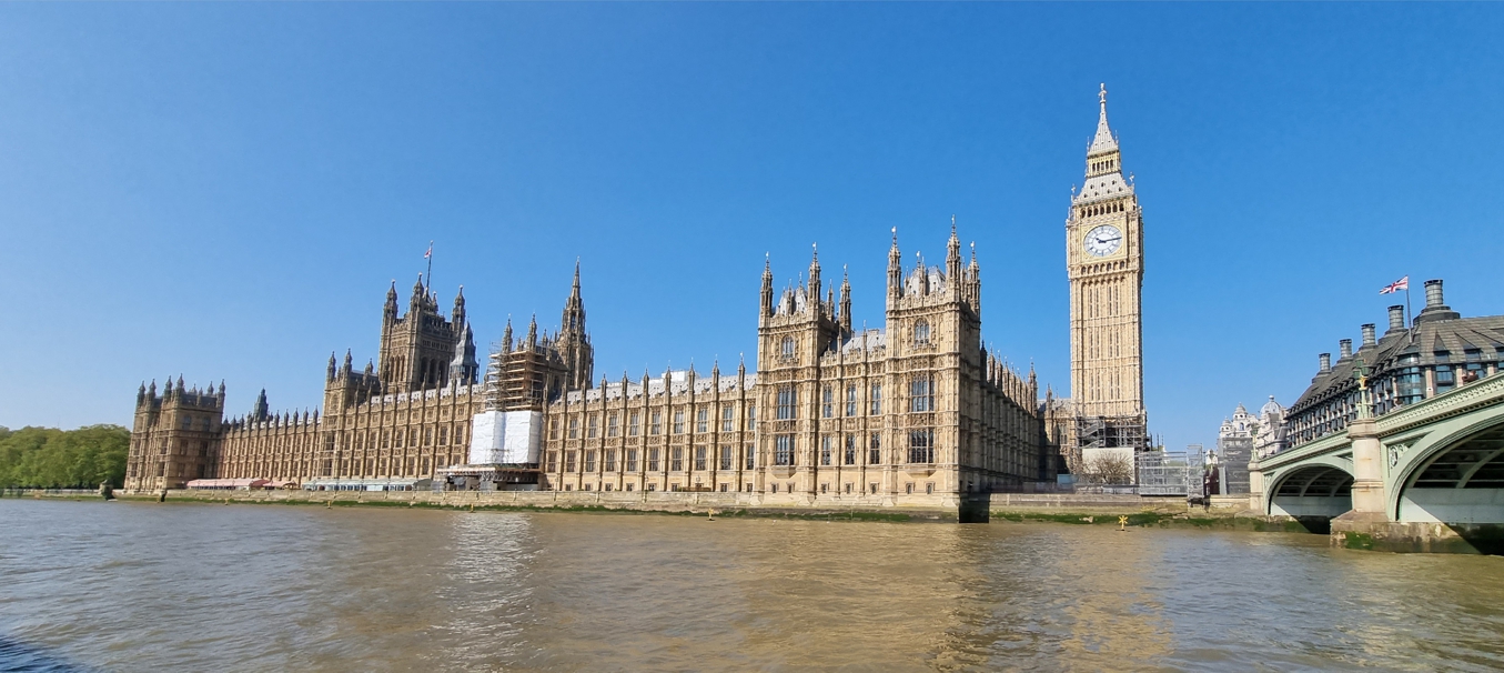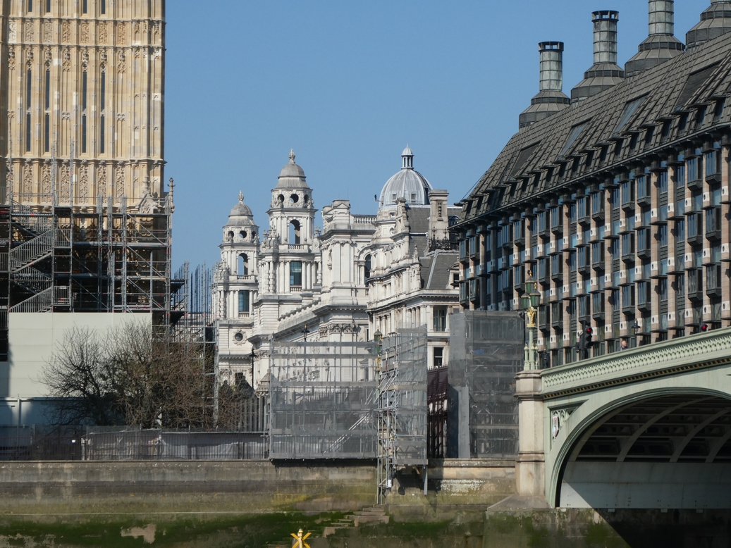 In Sicht ist nun auch der Big Ben. Wir fahren unter der Westminster Bridge hindurch, dann am Palace of Westminster, den Houses of Parliament vorbei, nach der Renovierung das Gestein nicht mehr schmutzig-grau, sondern hell, die goldglänzenden Verzierungen in der Sonne glitzernd.