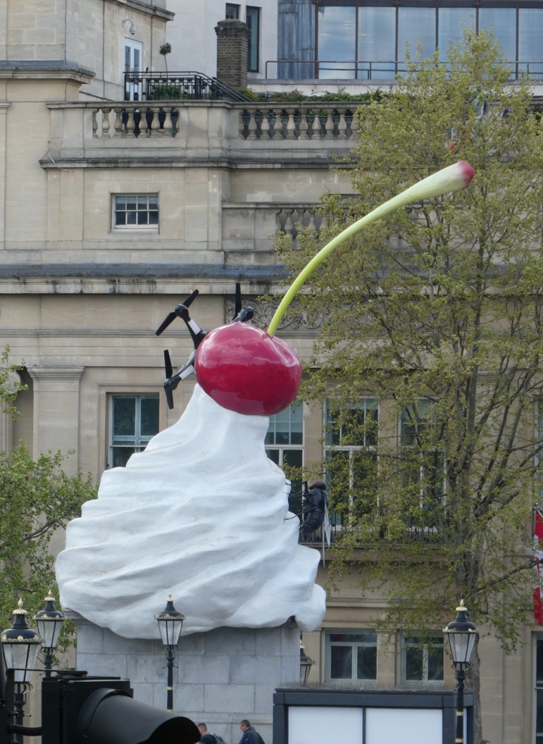 Wir steuern den Trafalgar Square an, sind schon ziemlich schlapp, umrunden den Platz und genehmigen uns einen Cappuccino in einem kleinen Cafè direkt am Platz, mit bester Aussicht auf das Geschehen. So wirklich Charme hat der Platz allerdings nicht, noch weniger bei dieser Wetterlage. Da hilft dann auch das neue Kunstwerk nicht weiter, der Sahnehaufen mit Kirsche obendrauf, samt Drohnen-Fliege; aber das Ding soll ja irgendwann 2022 wieder abgebaut werden.