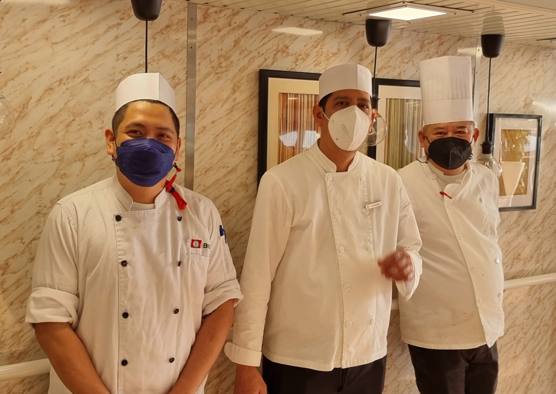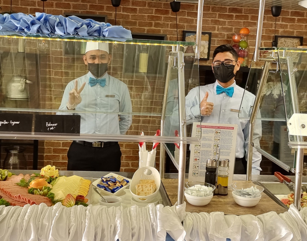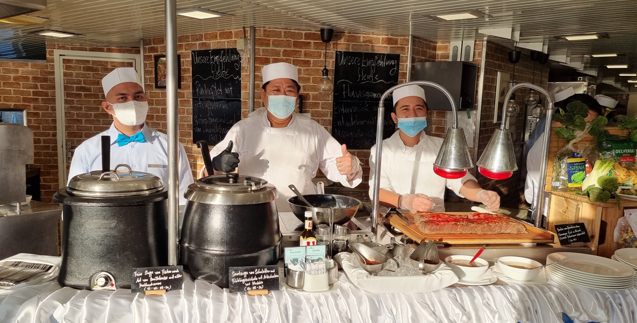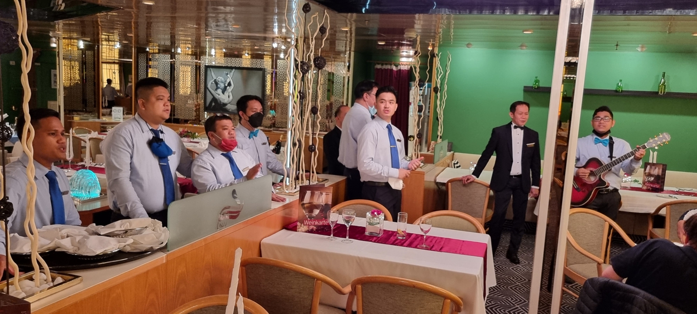 Die Wohlfühl-Atmosphäre auf dem Schiff, die wird vom Restaurant- und Kabinenteam sichergestellt, das vor allem von den Philippinen kommt – ein „Dream Team“, über das man sich als Gast einfach freuen muss. Verständigung in Deutsch und Englisch klappt bedingt, aber immer freundlich, nett, verbindlich, hilfsbereit. Immer ein paar persönliche Worte dabei, ob im Service oder am Grill oder an der Bar. Nichts ist anonym, Gäste werden wiedererkannt, oft gar mit dem Namen begrüßt. In der Küche merkt man, dass diese fest in ostasiatischer Hand ist und versucht, europäisch oder gar deutsch zu kochen, was anscheinend nicht leicht fällt – da ist man manchmal doch überrascht, was aus einem guten Stück Fleisch für ein merkwürdiges Ergebnis herauszuholen ist, wundert sich über ziemlich kreative oder manchmal auch schlappe oder geschmacklose Zusammenstellungen, erfreut sich an ziemlich bunten, klebrigen Nachtischkreationen. Alles nicht tragisch – aber eine etwas mehr europäisch geprägte korrektive Hand wäre sicherlich hilfreich.