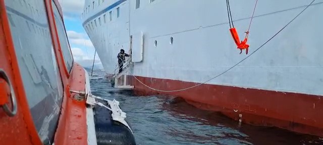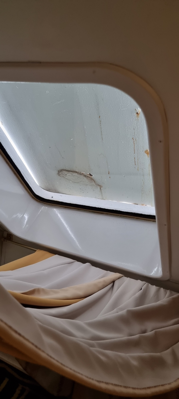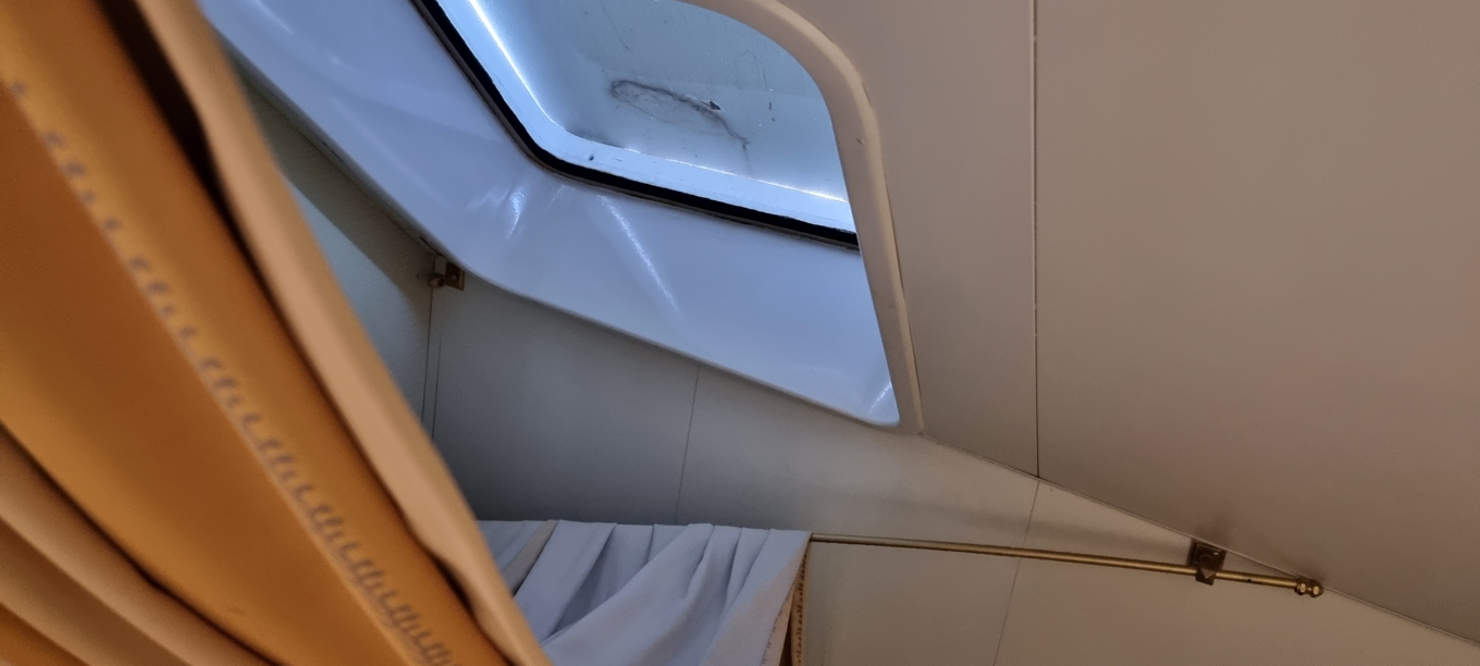 Als wir vom Abendessen zurück kommen, ist aus unserer Außenkabine, zum Bug hin liegend, eine Innenkabine geworden – das Fenster ist mit einer Stahlplatte zugeschraubt. Es wird also davon ausgegangen, dass die Bugspitze von den Wellen überrollt wird und diese selbst bei den weiter oben liegenden Kabinenfenstern Probleme verursachen könnten. Von Reisenden, deren Kabinen seitwärts weiter unten auf den Decks lagen hören wir am nächsten Tag, dass ihre Fenster schon einen Tag früher zugeschraubt worden seien.