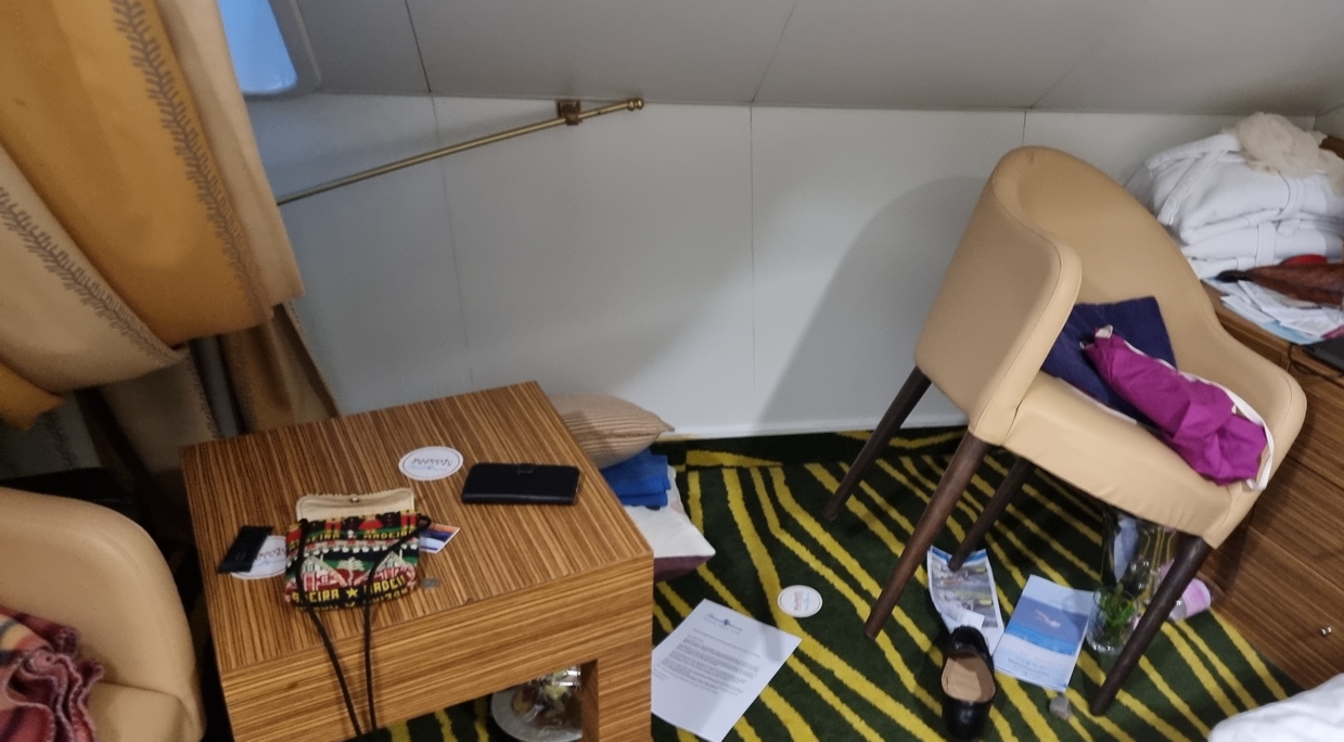 Nachts gab es noch ein Infoblatt, die sogenannte Bordzeitung auf der Kabine mit üblichen Infos, dazu der Hinweis, dass man doch die Koffer spätestens bis zum Schlafengehen vor die Tür stellen solle – in einer Sturmnacht, bei der man Mühe hatte, sich auf den Beinen zu halten, unbeschadet ins Bad zu gehen, in der die Schranktüren ständig aufsprangen, die Stühle umfielen, und vor der der Kreuzfahrtdirektor noch die Durchsage machte, man solle nichts auf den Tischchen oder im Bad in den Regalen stehen lassen, vor allem nirgendwo Gläser, da der Sturm so heftig sei.