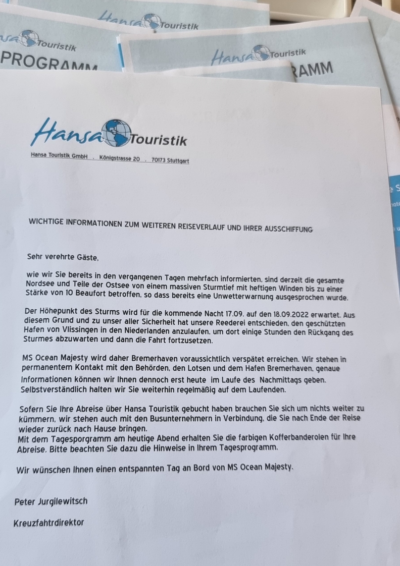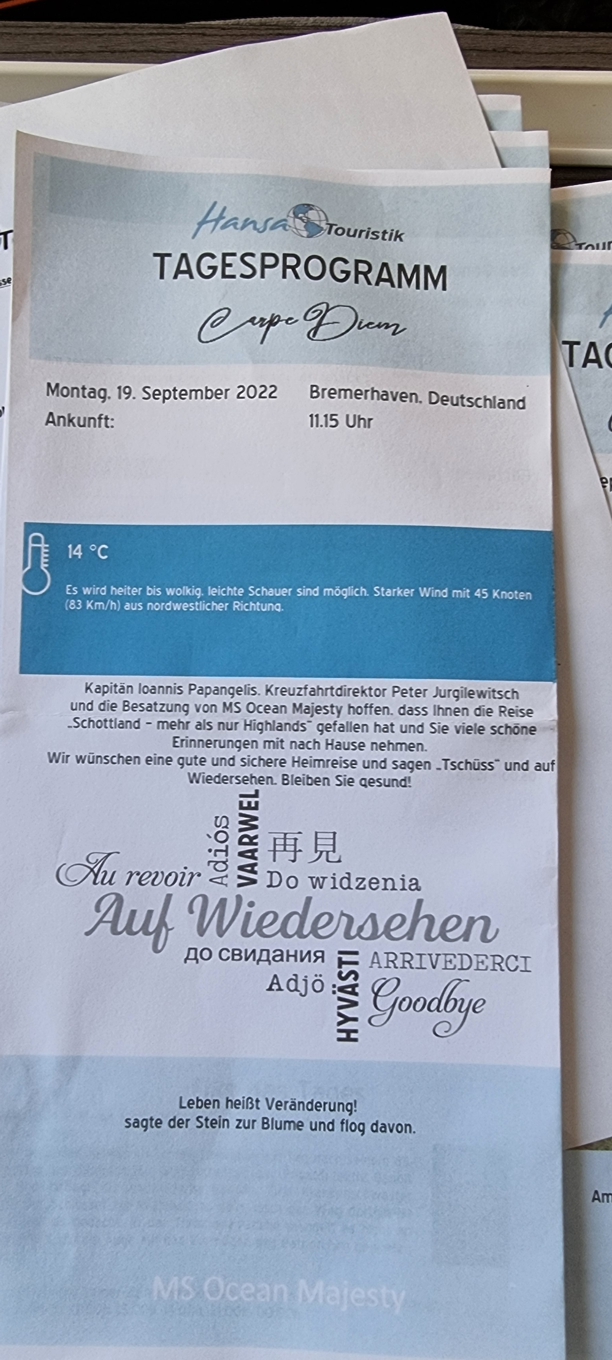 Am Abend dann die Botschaft: Der Kapitän hat doch recht. Bezeichnenderweise heißt es in der Mitteilung des Kreuzfahrtdirektors, dass die Reederei, also Majestic Cruises, entschieden habe, dass nicht vom Norden her in den Nordseesturm hineingefahren wird. Den zweiten Halbsatz einer solchen Meldung kann man sich ausdenken, da eben nicht die Reederei der Veranstalter der Kreuzfahrt ist. Man würde die Reise komplett umstellen, die britischen Inseln umrunden, versuchen, noch einen Hafen einzuplanen und die restliche Zeit für Seetage verwenden, um durch den Ärmelkanal zurück nach Bremerhaven zu kreuzen. Man gehe davon aus, dass der Sturm auf der Nordsee sich bis dahin so weit gelegt habe, dass man rechtzeitig am Sonntag anlegen könne.