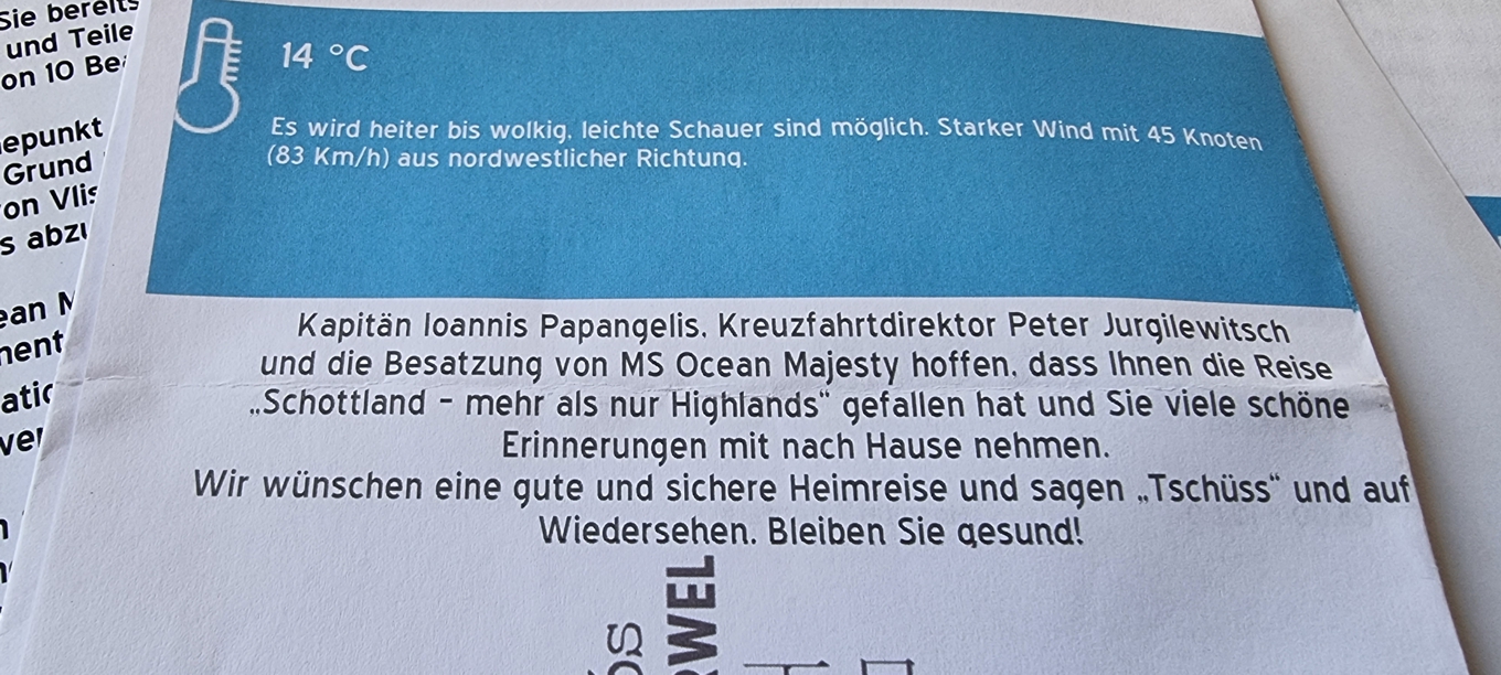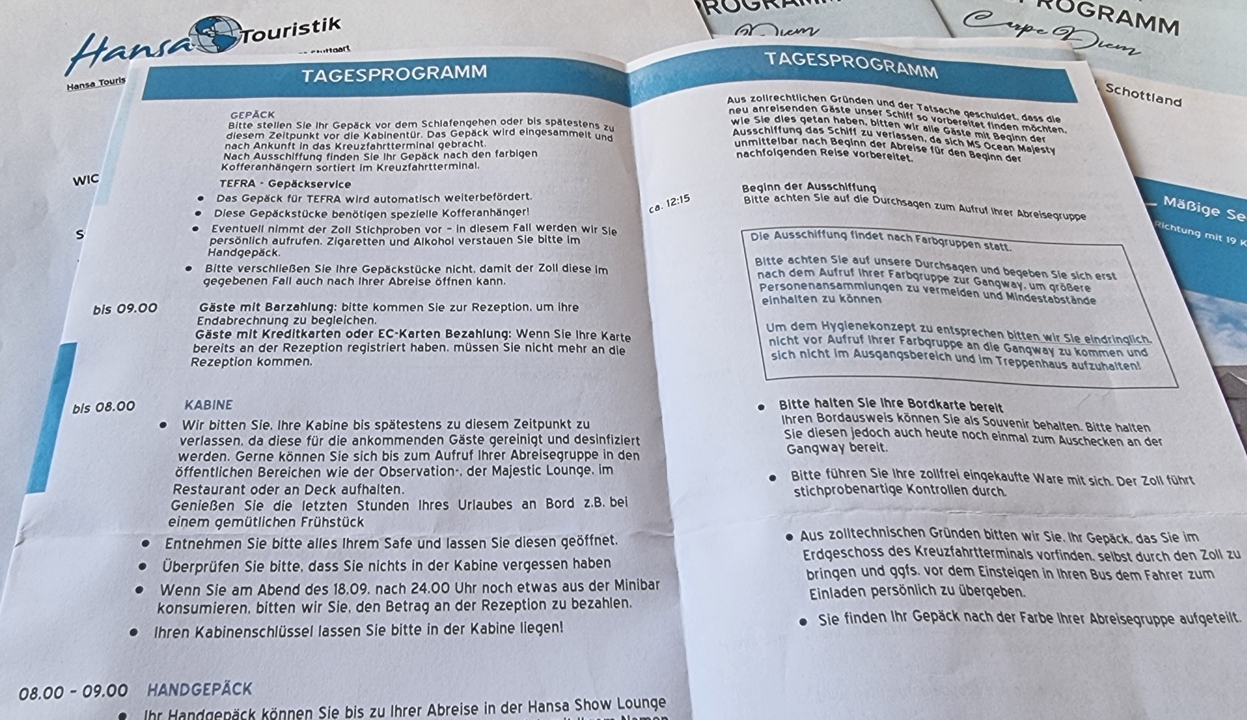 Dazu die Info, man solle doch die Kabine spätestens um 8 Uhr verlassen, um 12.15 Uhr sei Ausschiffung. Dann die übliche Floskel, dass Kapitän, Kreuzfahrtdirektor und Crew hoffen, dass uns die Reise „Schottland – mehr als nur Highlands“ gefallen habe und wir viele schöne Erinnerungen mit nach Hause nehmen würden. Man kann nur bestätigen, dass uns weit mehr als die Highlands geboten wurden, und besondere Erinnerungen, ja, die gibt es auch.