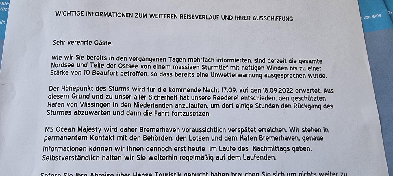 Irgendwann kommt die Meldung, dass das Wetter so schlecht sei, dass man noch bis zum Hafen Vlissingen in den Niederlanden, auf Zeeland fahren und dort in einem geschützten Hafenbereich ankern wolle, bis der Sturm sich hoffentlich so weit gelegt habe, dass man weiterfahren könne. Angeblich noch in der Nacht. Gegen Mitternacht angelegt, nach einer mehr als zweistündigen Einfahrt vorbei am eigentlichen Hafen von Vlissingen, bis hinein ans Ende der Bucht, wo es nicht mehr weitergeht, mit einer Verspätung von mehr als fünf Stunden – angemeldet war das Schiff, so wie wir uns an die Anzeige der Hafenbehörde erinnern, um 17.30 oder 18.30 Uhr. Und dann noch in der gleichen Nacht weiterfahren? Da werden selbst Märchen unglaubwürdig. Unbeirrt steht in dem am Abend verteilten Programm für den nächsten Tag die Info zur Ausschiffung am Sonntag frühmorgens, in Bremerhaven.