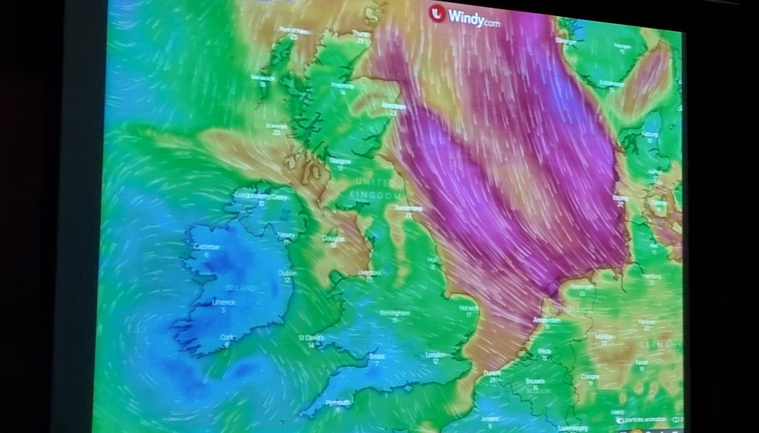 Die greifbaren Wetterberichte sagen zu dem Zeitpunkt aus, dass sich der Sturm zur deutschen Nordseeküste hin gar verstärkt habe. Allerdings bekommen wir Passagiere das nicht von der Schiffsleitung präsentiert, so wie einige Tage zuvor noch – das muss man selbst nachsehen. Wenige Bereich der Wetterkarte zeigen noch Windstärke 9, die meisten 10, einige gar 11.