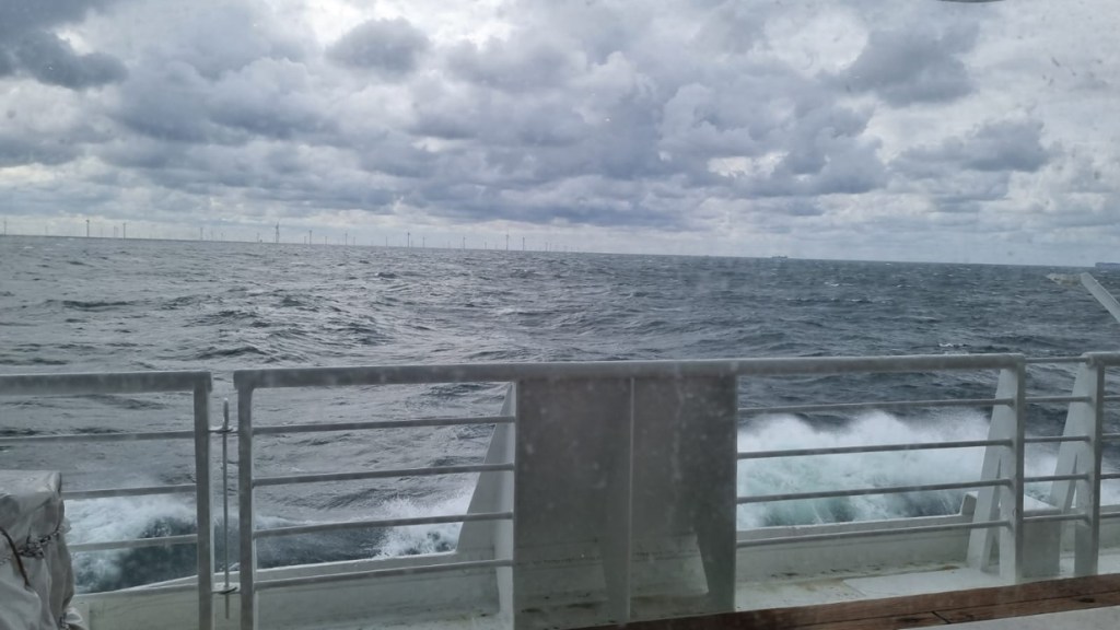 Wie zu erwarten stehen wir am nächsten Morgen noch vor Vlissingen, ohne an Land gehen zu können. Es wird ja geankert. Durchsage, dass sich der Sturm so darstellen würde, dass man entschieden habe, weiterzufahren, 10 Uhr, Abfahrtszeit irgendwann ist dann irgendwann nach 11 Uhr. Es heißt, andere Schiffe hätten Vorrang. Auf die Uhr schauen wir nicht; wir regen uns nur darüber auf, dass die Schiffsleitung entschieden hat, mitten hinein in den Sturm zu fahren und keine Möglichkeit eröffnet, vorher an Land zu gehen, einfach auszusteigen.