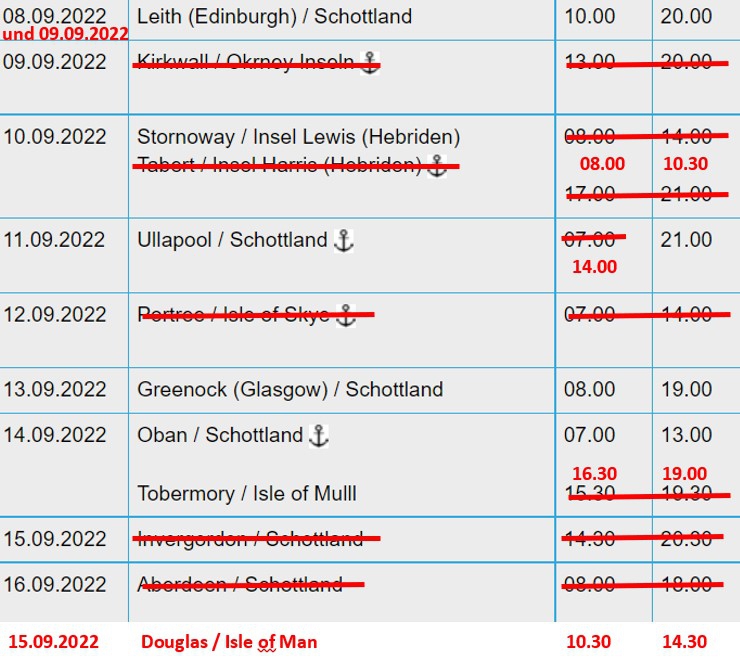 Von 11 Häfen in Schottland, die angelaufen werden sollten, sind gerade einmal 6 übrig geblieben, davon einer mit Marginal-Anlaufzeit und zwei ziemlich eingekürzt. Würde man die Liegezeiten aufrechnen, dann wären es bei den schottischen Inseln, an denen uns so viel lag, nach Abzug der Tenderzeiten gerade mal etwa 5 Stunden, die übrig geblieben sind – ziemlich wenig Zeit für das, was wir eigentlich gerade hier sehen wollten.