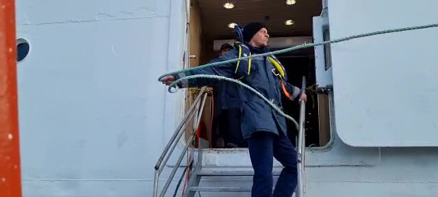 Am Ausstieg – kein Mensch von Hansatouristik, der die Gäste verabschiedet. Merkwürdig. Den Kreuzfahrtdirektor sehen wir an der Reling, er spricht mit einem der Offiziere, macht auch ein Foto von aussteigenden Gästen. Warum auch immer. Wir sind sicherlich auch drauf.