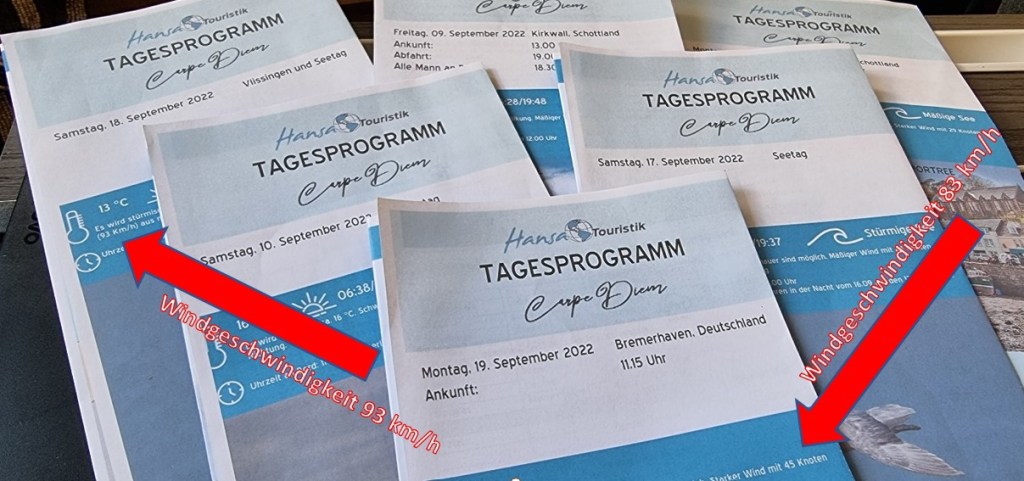 Irgendwie amüsant, dass die Redaktion des Tagesprogrammes tatsächlich wagt, die Windgeschwindigkeiten, in die wir hineinfahren, auszudrucken. Da steht im Programm, dass 83 Stundenkilometer erwartet würden, für den anderen Tag gar 93 Stundenkilometer. Das ist nicht nur Sturm, sondern gar schwerer Sturm – mit Wellenhöhen um die 10 Meter! Also „fröhliches“ Schiffschaukeln“ für uns vorgesehen!