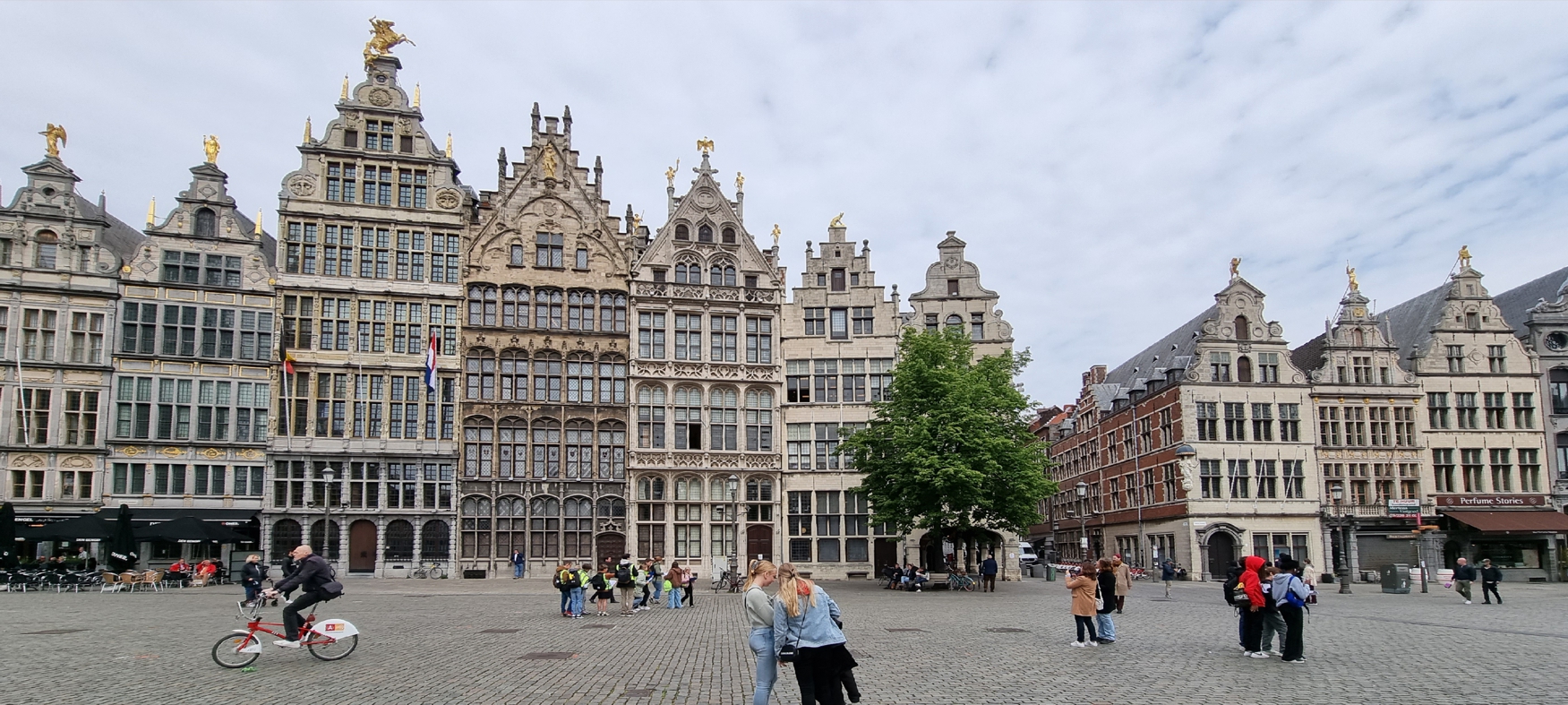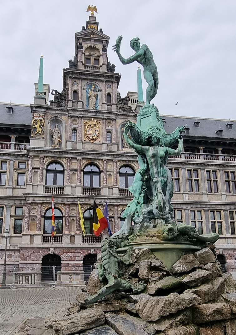 Nach nur wenigen hundert Metern sind wir mitten im Geschehen, auf dem Grote Plaats mit den prachtvollen Handelshäusern. Auf dem Platz der Brabo-Brunnen; ein Scherzbold, der anscheinend gut klettern konnte, hat der Dame an dominierender Stelle zwei Kronkorken verpasst.
